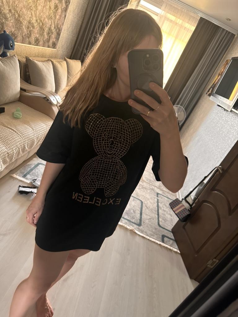Women Shiny Gold Diamond Bear Printed Short Sleeve Hip Hop Loose Casual T-shirt