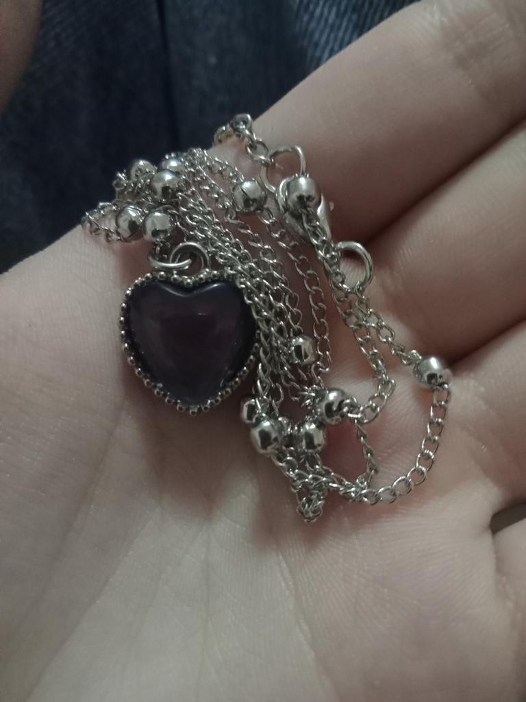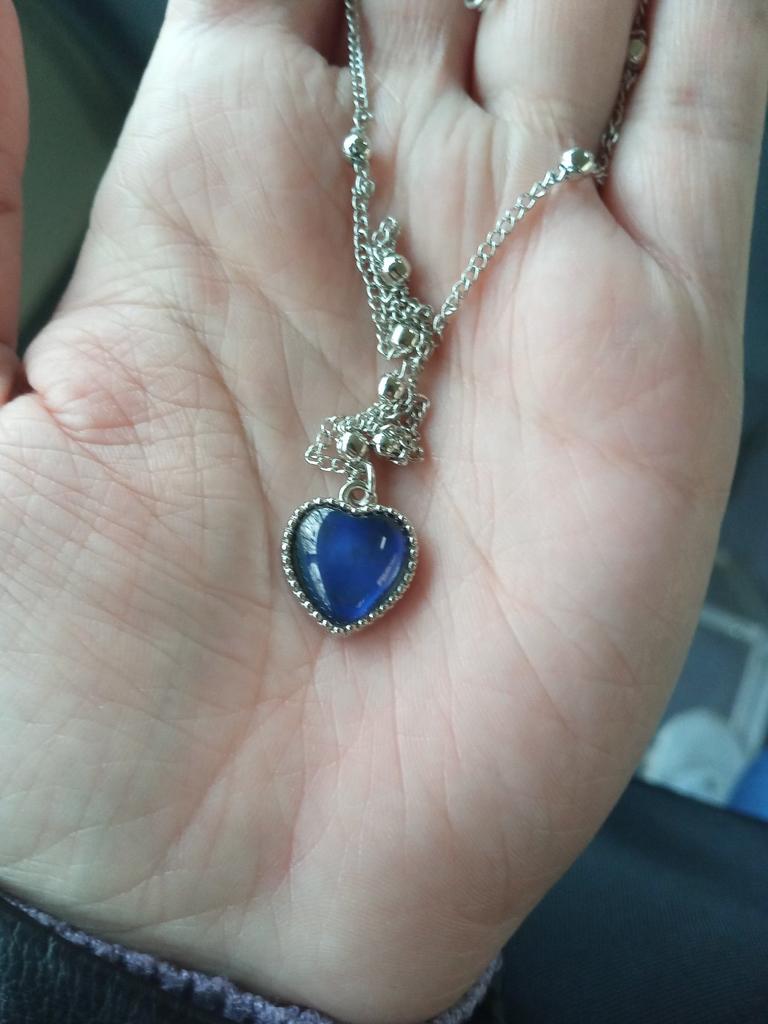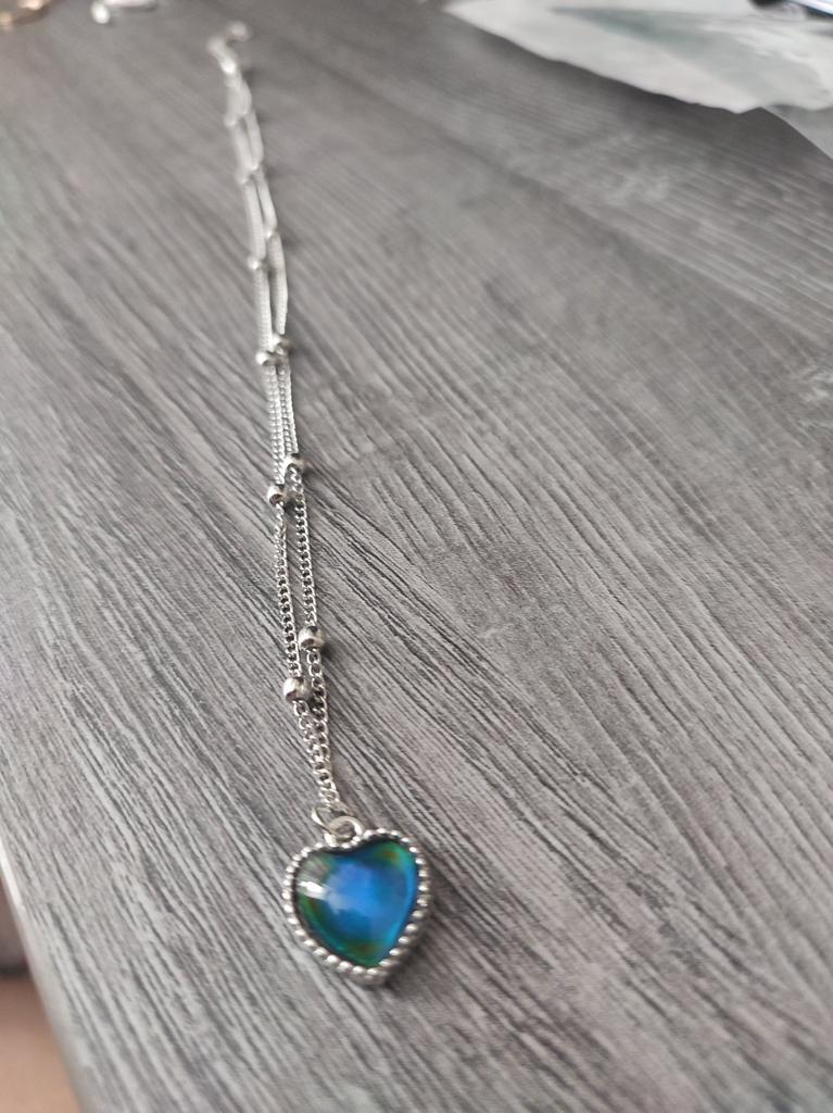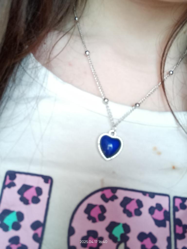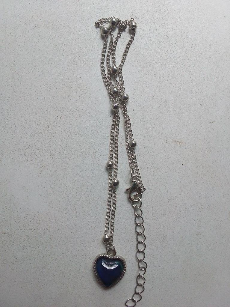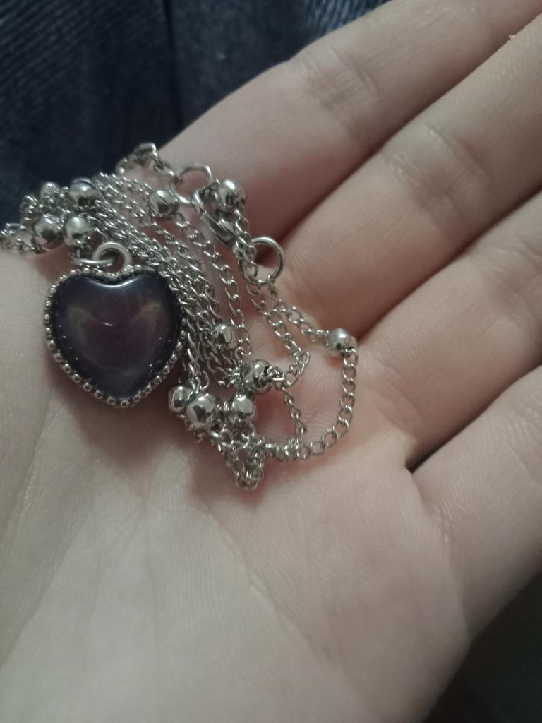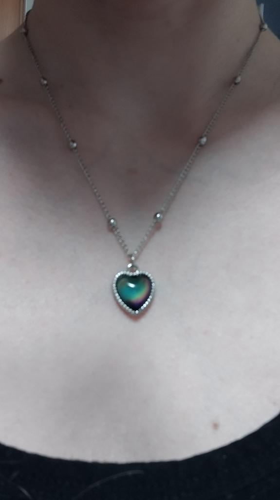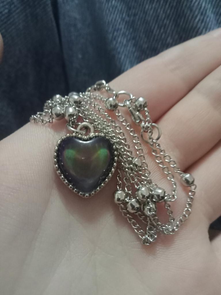 Pendant with a heart-shaped pendant. The pendant does change color depending on the temperature, for example, blue, green, brown, purple, gray. I liked it, the colors are bright. The chain is short, the pendant can only be worn with this chain, because the pendant cannot be removed because of the decorative balls. I wear it for several weeks until it gets dark.