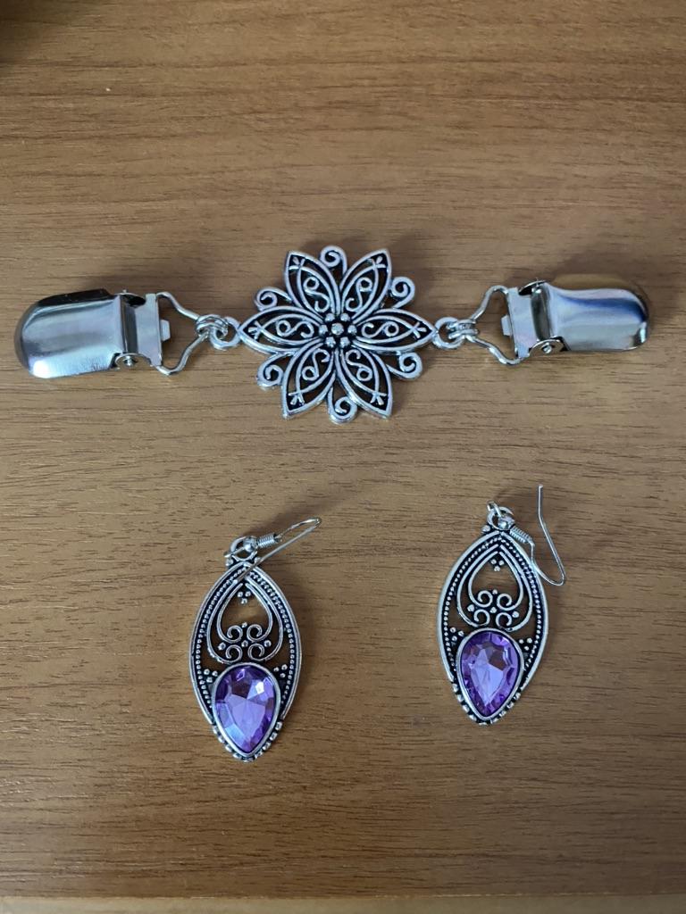 Cheap costume jewelry, interesting shape, but purple stones on an opaque base, apparently not bright enough when held up to the light.