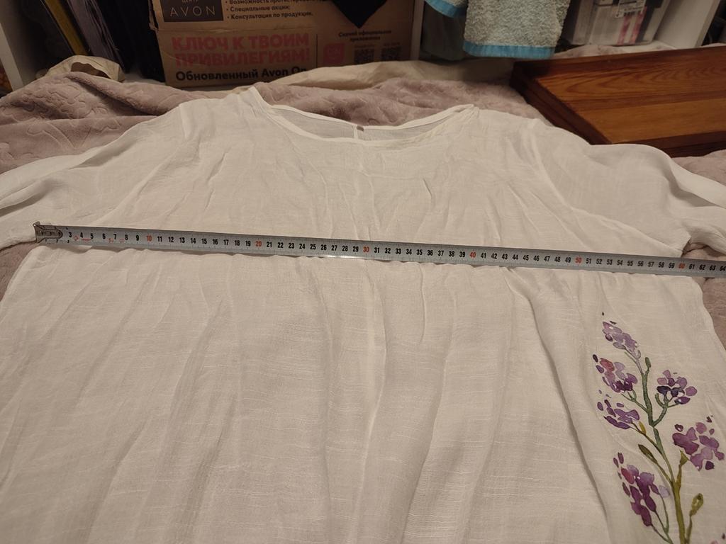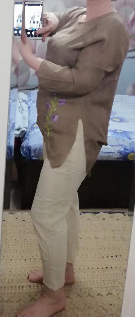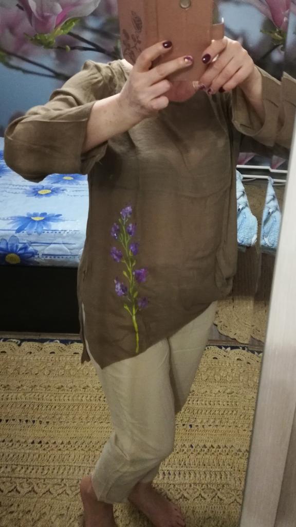 A thin, breathable blouse, crushed cotton. The sleeves, as always with Chinese clothes, are a bit narrow. The trim is a pattern, not embroidery, so it's a bit expensive. And a very wide neckline.