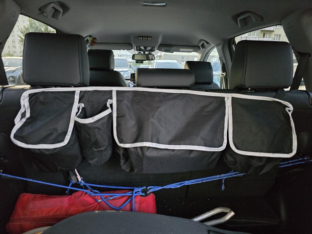 Hung on the rear seat headrests, it fit a lot of small items that used to roll around in the trunk.
