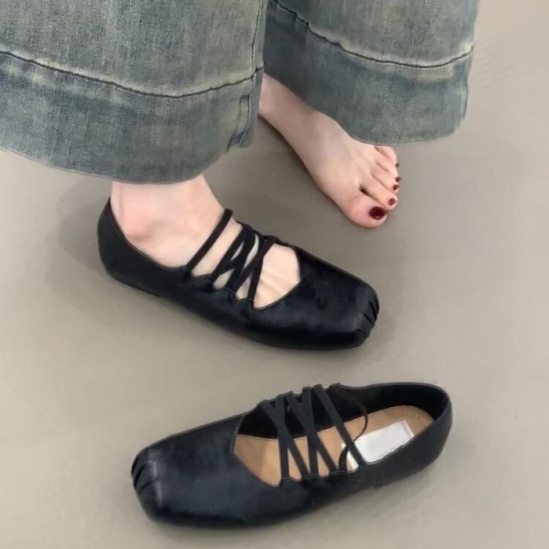 Retro Cross-laced Flat Shoes Square-toed Ballet Shoes Women's Shallow Opening Single Shoes