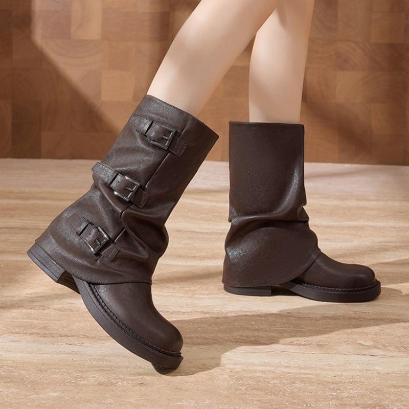 Han Shoe Inner Pile Boots Skinny Medium Boots Children's 2025 Autumn and Winter New British Style Retro Belt Buckle Western Boots