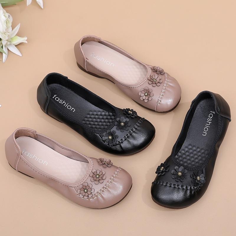 Shallow Shoes Single Shoes Soft Sole Non-slip Medium Leather Shoes Flat Sole Medium the Elderly Women's Shoes Spring and Autumn