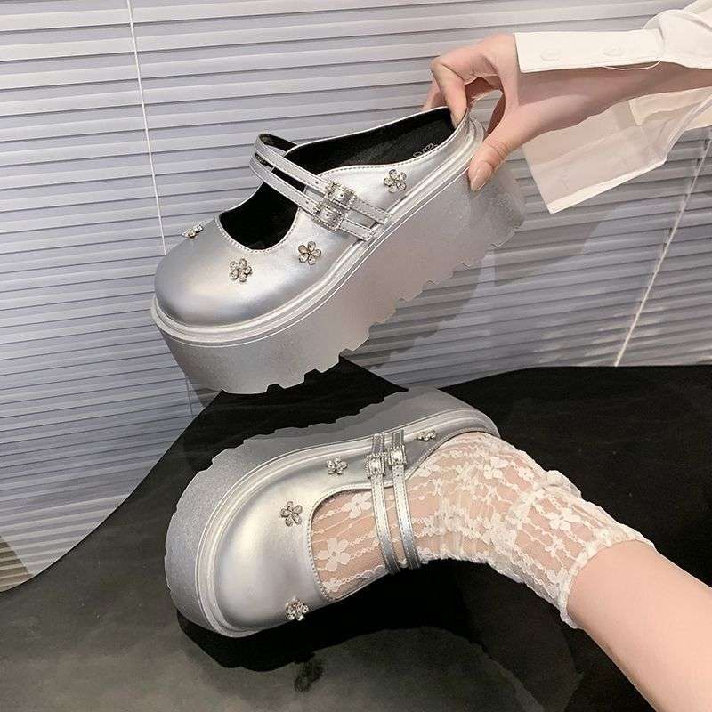 Thick-soled Heightening Mary Jane Shoes Women's Shoes 2025 New Small Double Straps Rhinestone Patent Leather Heightening Half Slippers Women