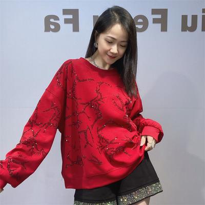 Laid-back Style Round-neck Large-sized Sweatshirt for Women Loose Pullover Top for Autumn and Winter Rhinestone Jacket