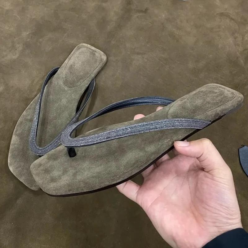 Fashion Fashion Square Toe Crystal Narrow Band Flat Slippers High Quality Faux Suede Clip Toe Flip Flops Women Comfort Casual Beach Shoe