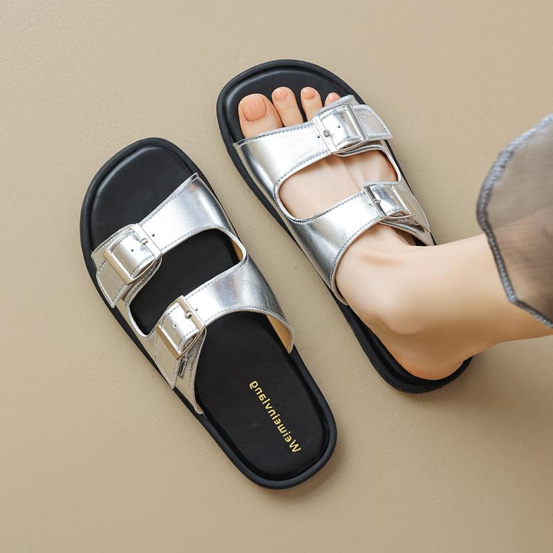 Fashion Silver Belt Buckle Flat Sandals Woman Causal Slides Shoes Summer Two Strap Slippers Beach Flipflops Cozy Slip On Sandalias Mujer