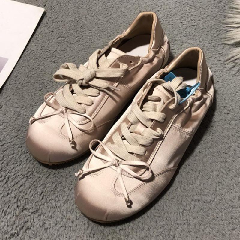 Fashion High Quality Satin Lace-up Flats Women Silver Gray Bow Round Toe Sneakers Comfortable Lightweight Non-slip Zapatillas De Mujer