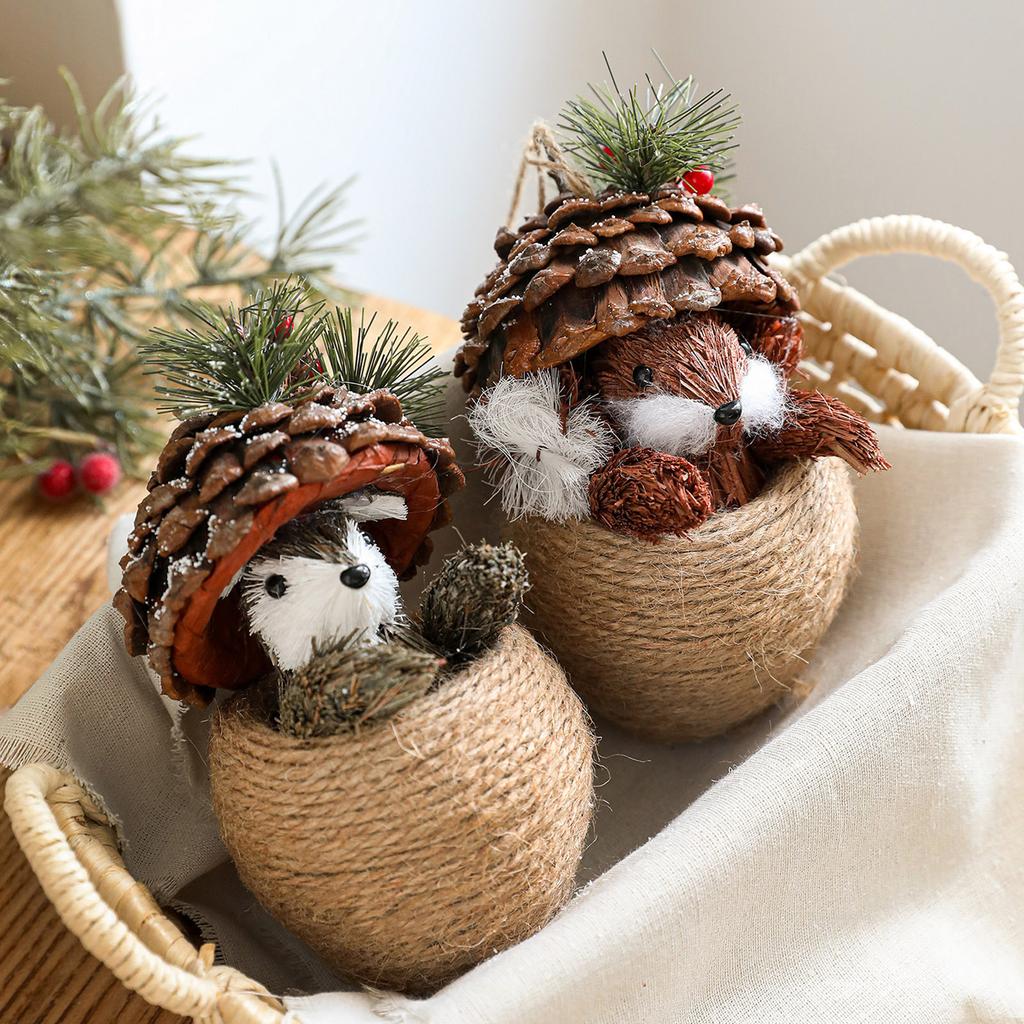 Wooden Hat, Squirrel, Hemp Rope, Sisal Desktop Ornaments, Hand-woven Straw Christmas Tree