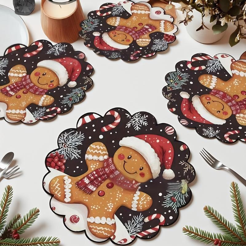 4PCS Christmas Circular Waves Placemats Non Slip Heat Resistant Table Mats Winter Dining Party Christmas Decor Round Tablecloth