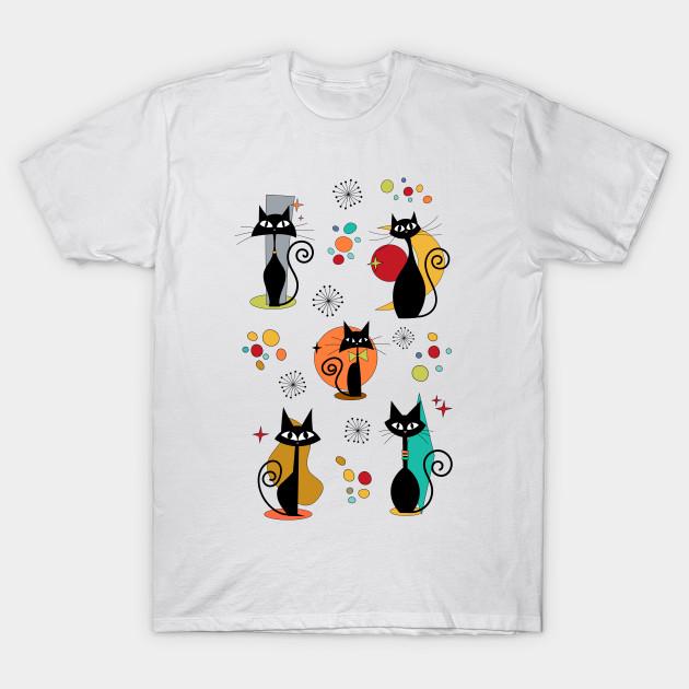 Men Black Print T-shirt Mid Century Atomic Black Cats - Retro Colorful Feline Art No-Cut Transfer Paper Print Cotton Tshirt
