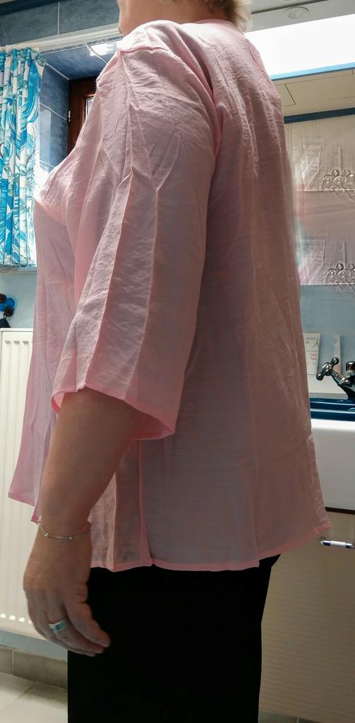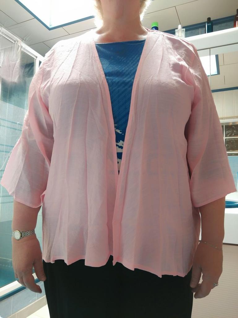 Väga hea väike jope, täiesti kerge kangas (35% polüester, 65% viskoos). Päris roosa. Ma kannan suurust 52/54 ja see sobib palju õhku!