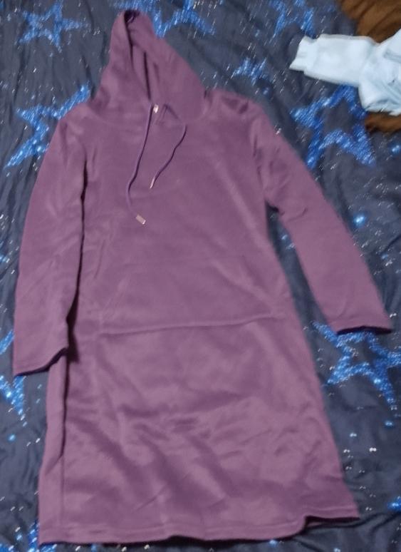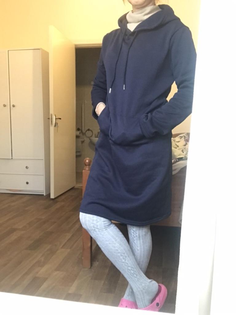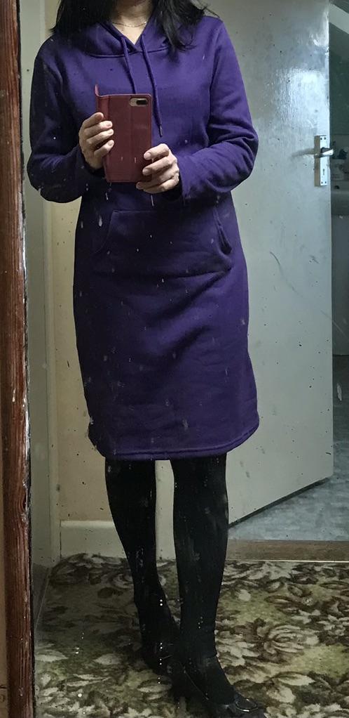 Olen rahul. Varrukad veidi liiga lühikesed. Aga pole probleemi.Tegelikult kannan suurust 40, aga eelistasin kindluse mõttes XL suurust tellida. Sobib suurepäraselt. Tellisin halli ja triibulise kapuutsiga kleidi. Triibuline on õhemast materjalist. Ma pole seda veel pesnud.