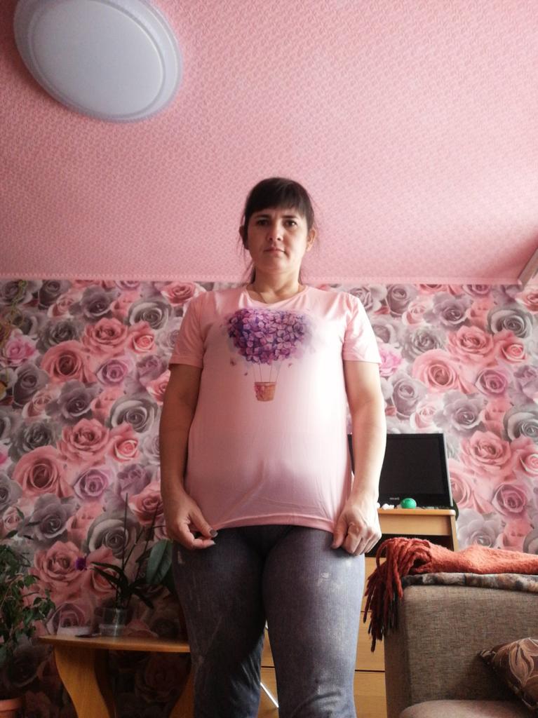 T-särk on M-suuruses ja ausalt öeldes pole see päris puuvillane, elastaan on väga märgatav, natuke lühike ja kitsas... Noh, meile see eriti ei meeldinud... kangas on külm.