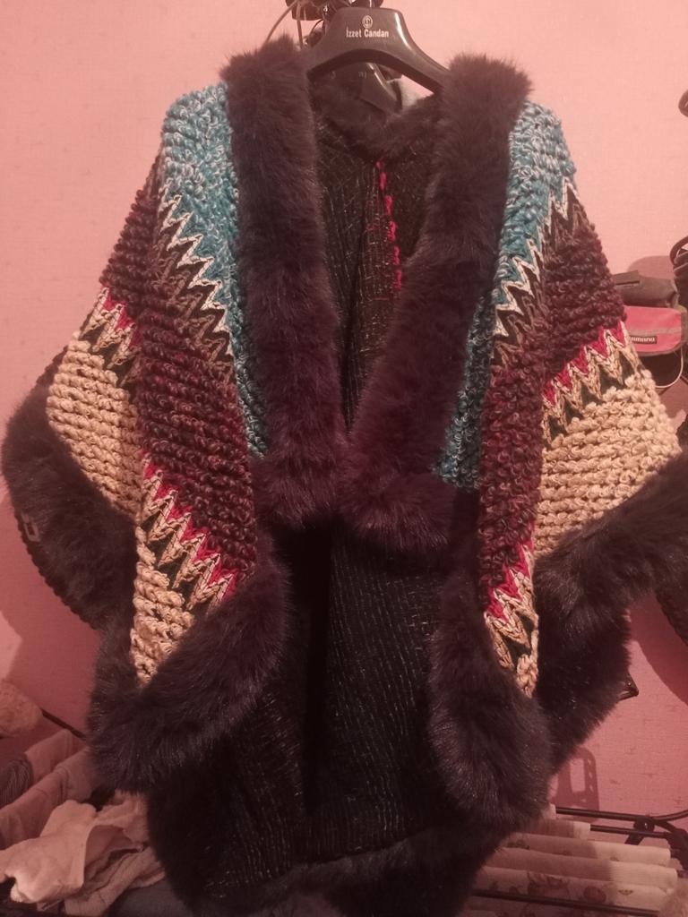 Originaalne keep, tunne järgi mitte väga paks sall karusnahaga äärtel. Ma arvan, et külgedelt natuke kinni õmmelda, et see õlgadelt maha ei libiseks. Ja mingi originaalne nööp kinnitamiseks. Külmal aastaajal saab jope peale visata. Suvel sobib õhtusteks jalutuskäikudeks. Sarnaneb etno rõivastega, nagu pontšo.