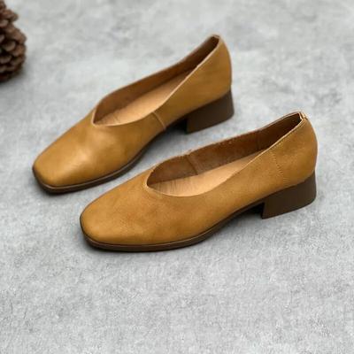 Johnature Square Toe Shallow Pumps Fashion Genuine Leather Thick Heels Versatile Women's Slip-on Shoes