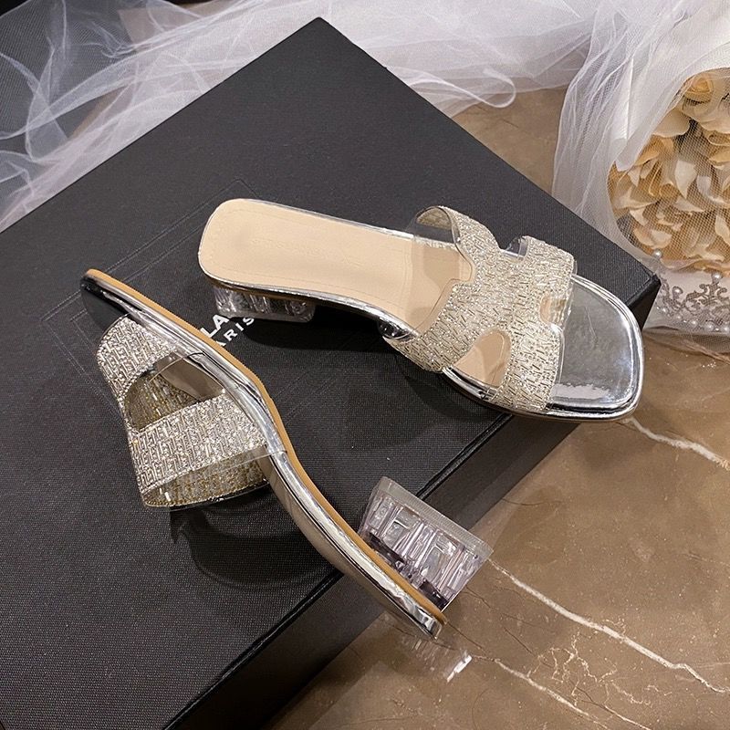 Temperament New transparent rhinestone low-heeled women's sandals 2025 summer out slippers women's non-slip versatile sandals