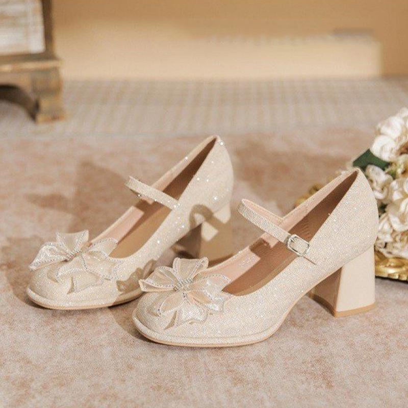 Round head Mary Jane women's shoes new thick heel fashion single shoes with sparkling bow fairy high heels