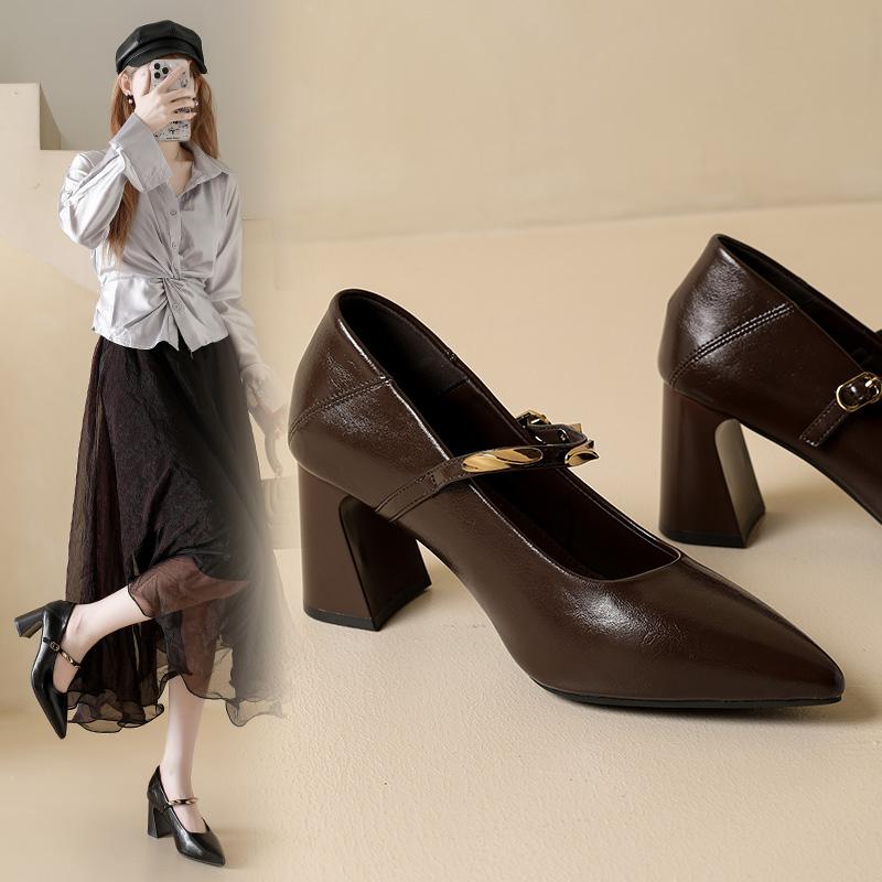 Fashion A new French pointed-toe, chunk-heeled single shoe for women, featuring a retro metal one-shoulder strap and a shallow opening