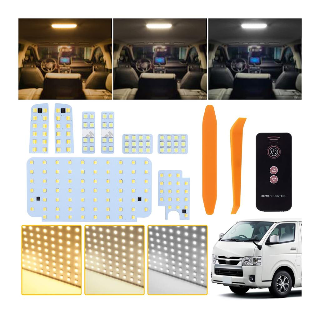 Product Specifications: Compatible models: Toyota 200 Series Hiace/Regius Ace 200 Series (KDH200/TRH200 Series/GDH200 Series): Standard/Wide Body Compatible Super GL 4th/5th/6th Generation Exclusively. Set Contents: Front Lamps 14-Piece x 2 (3 Colors), Center Lamp 12-Piece x 1 (3 Colors), Back Door Lamp: 35-Piece x 1 (3 Colors), Foot Lamps 12-Piece x 2 (Single Color), License Lamp 8-Piece x 1 (Single Color). Remote Control x 1, Installation Tools x 2, Instruction Manual x 1.