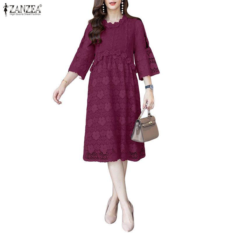 ZANZEA Women Round Neck 3/4 Sleeve Casual Elegant Lace Dress