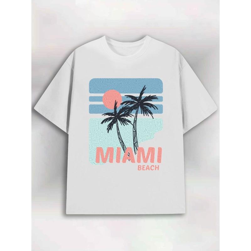 Men'S Round Neck T-Shirt in White Featuring a Miami Beach Palm Graphic,Ideal for Summer Activities And Hip-Hop Streetwear ,with Trendy Printed Designs