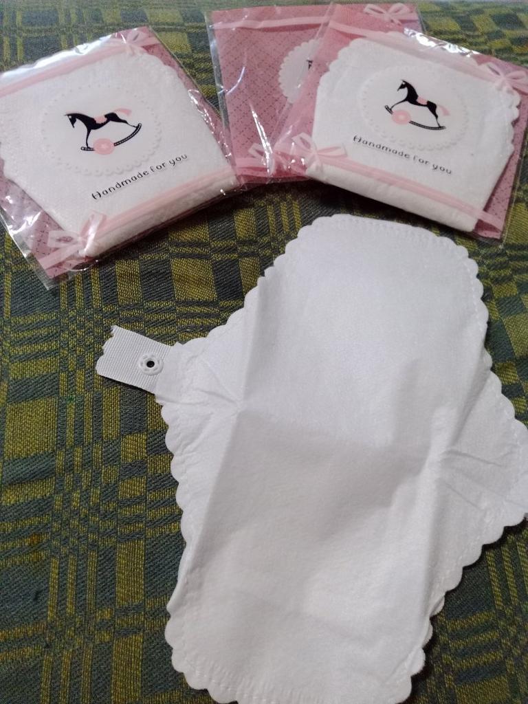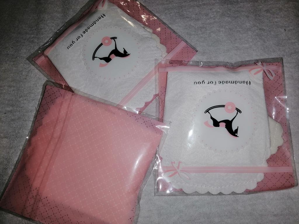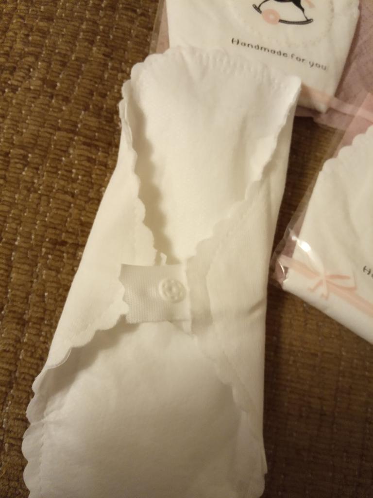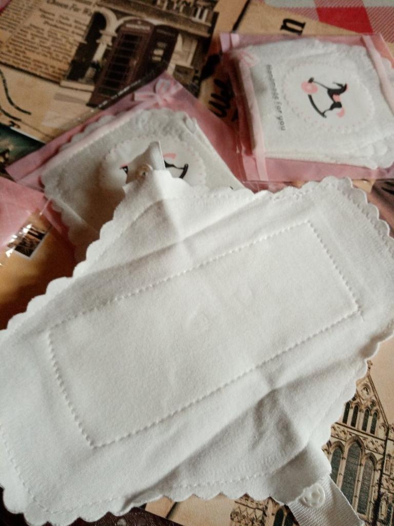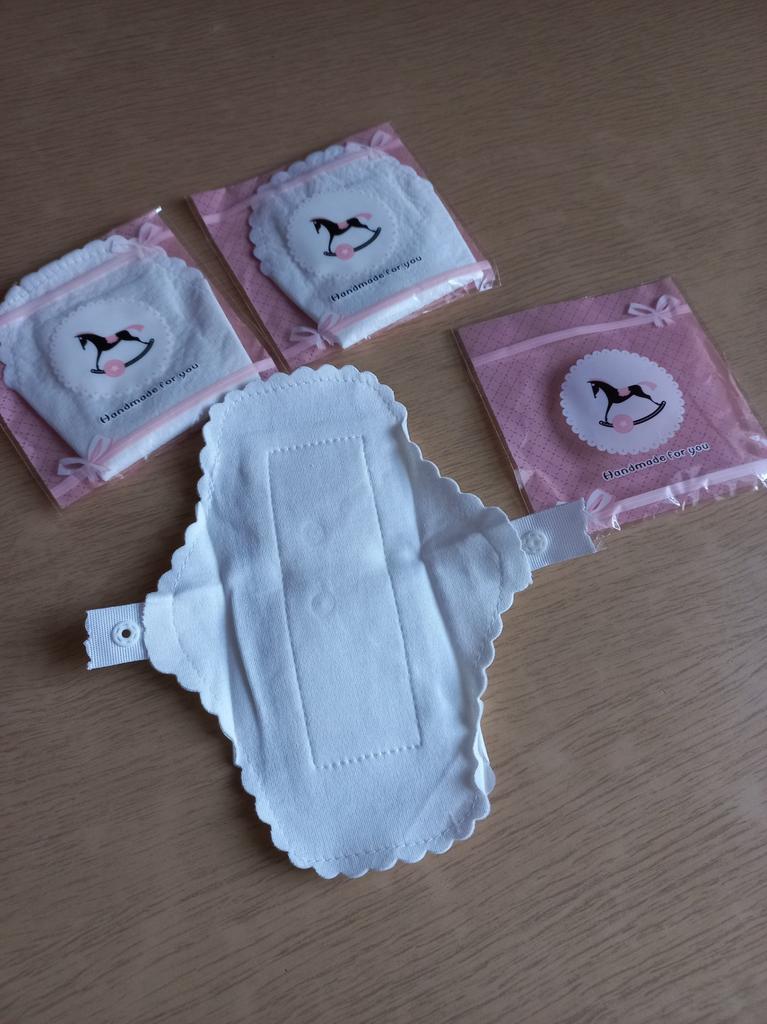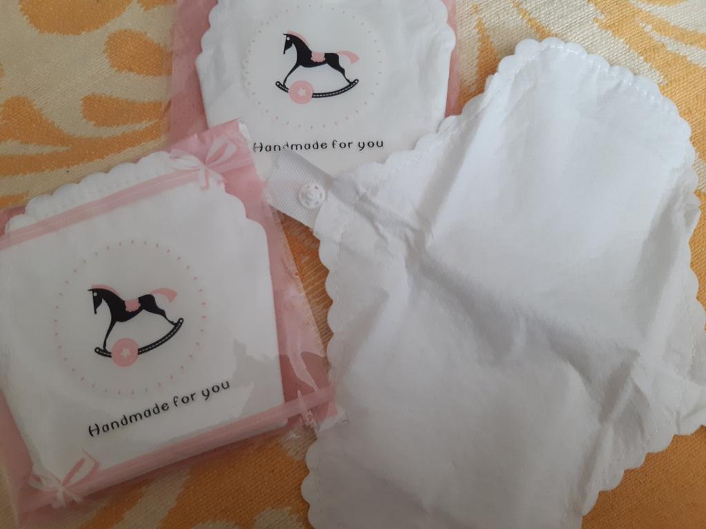 Les tampons réutilisables sont arrivés bien emballés. Ils sont blancs avec un bord dentelé. Ils sont de taille parfaite. De plus, ils ne sont pas trop gras.