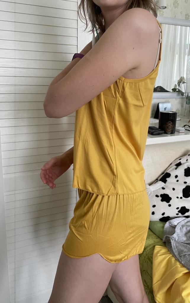 La taille est un peu plus petite que prévu et le haut plus court que sur le modèle donc soyez conscient de cela lors de la commande je commanderais une taille plus grande