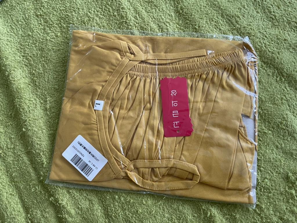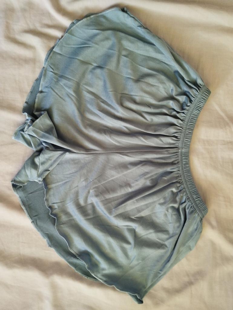 Dans l'ensemble tissu normal, doux et confortable. La taille est convenable. Mais il y a un trou dans le short, la couture s'est un peu décollée je suppose. Ce n'est pas trop mal, ça peut être ourlé, mais ça aurait pu être mieux.