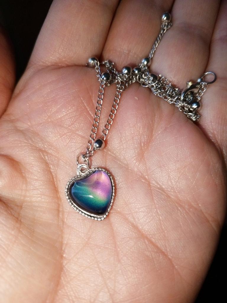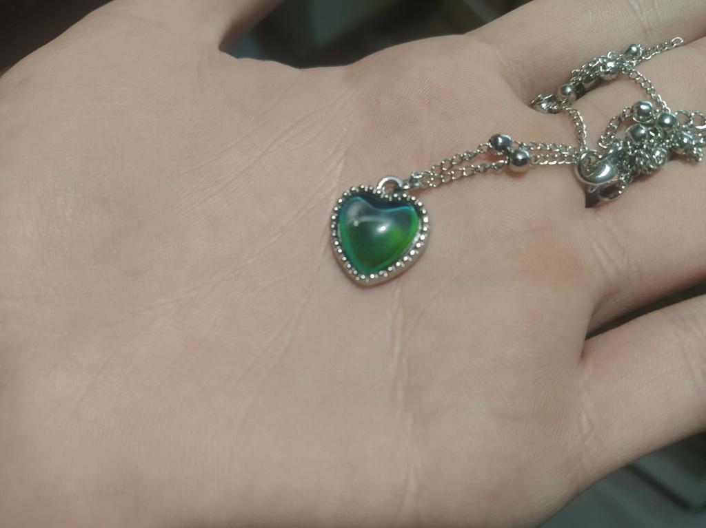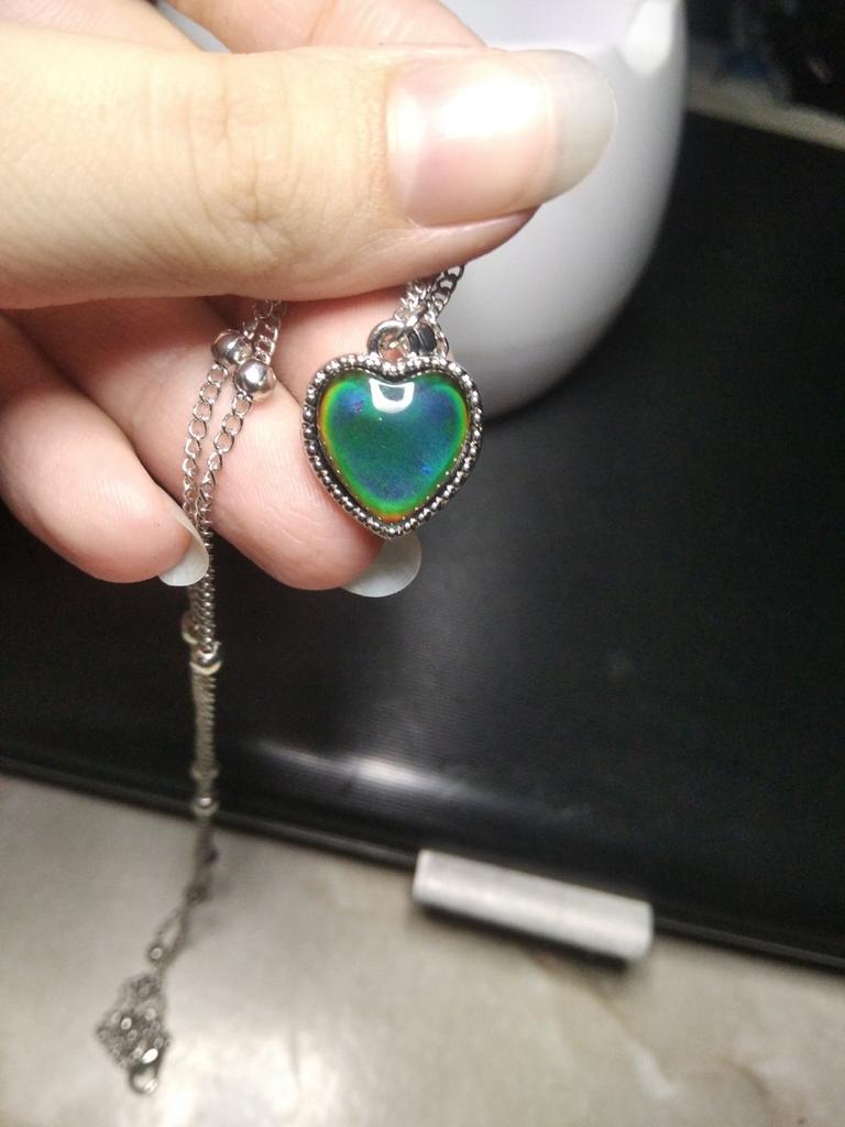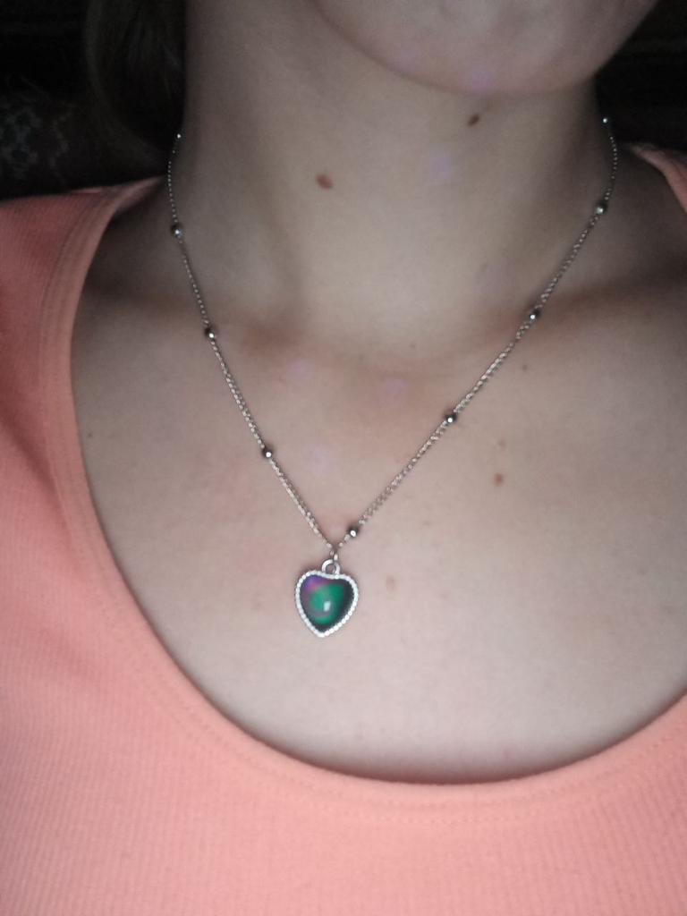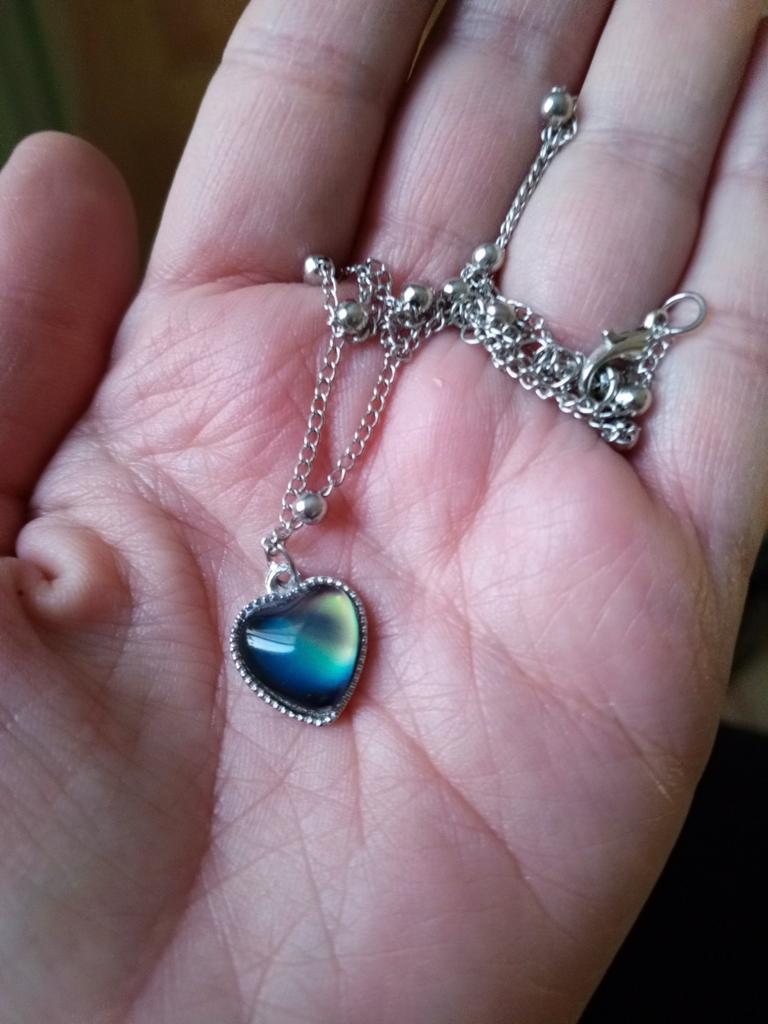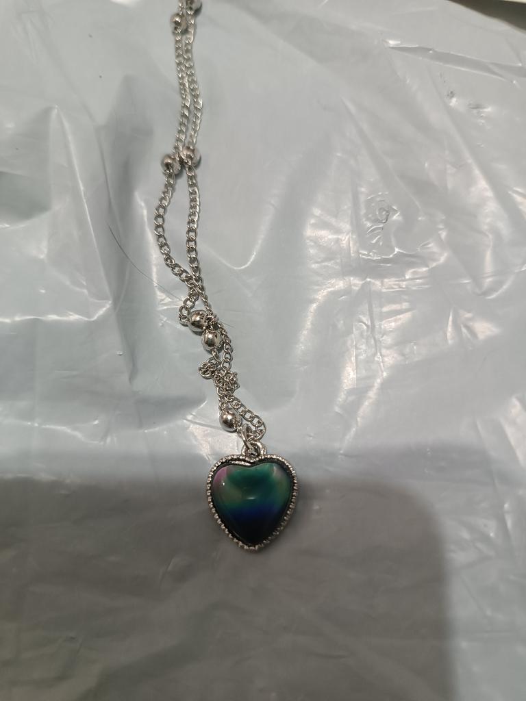 Pendentif avec un pendentif en forme de coeur. Le pendentif change de couleur en fonction de la température, par exemple bleu, vert, marron, violet, gris. J'ai bien aimé, les couleurs sont vives. La chaîne est courte, le pendentif ne peut être porté qu'avec cette chaîne, car le pendentif ne peut pas être retiré à cause des boules décoratives. Je le porte pendant plusieurs semaines jusqu'à ce qu'il fasse nuit.