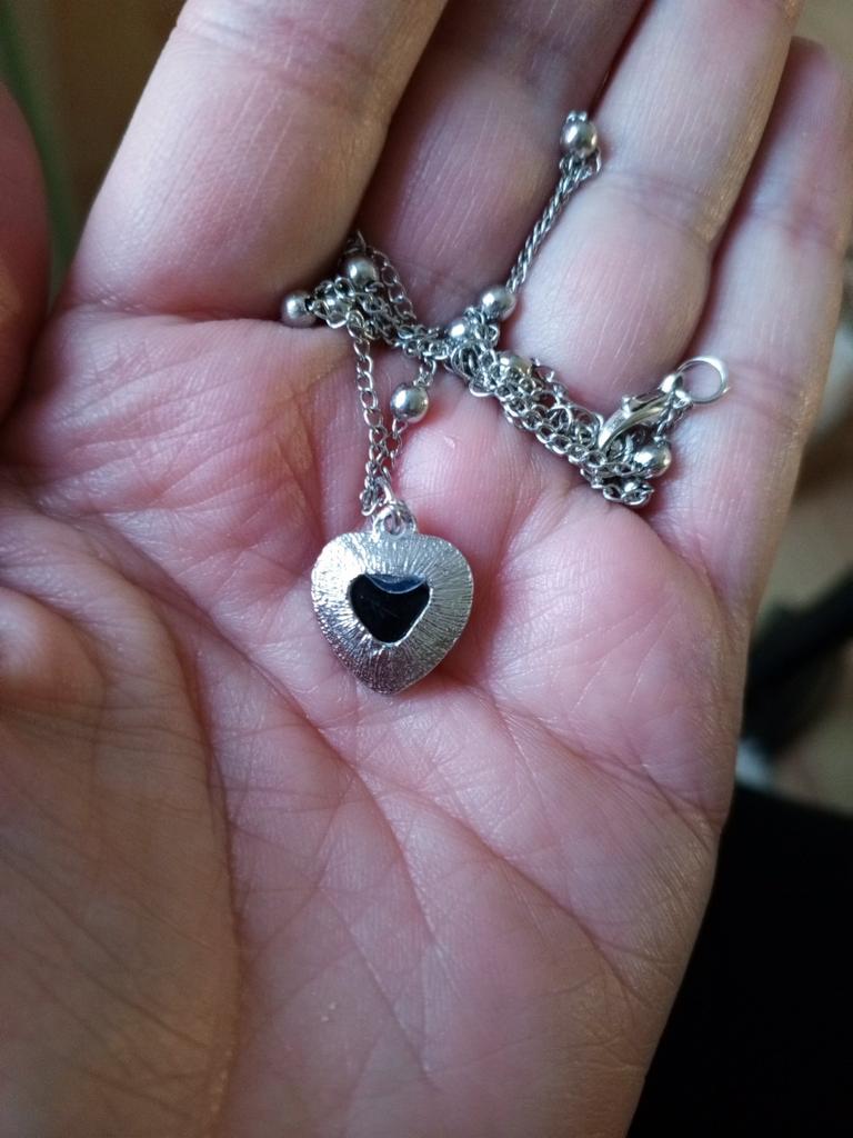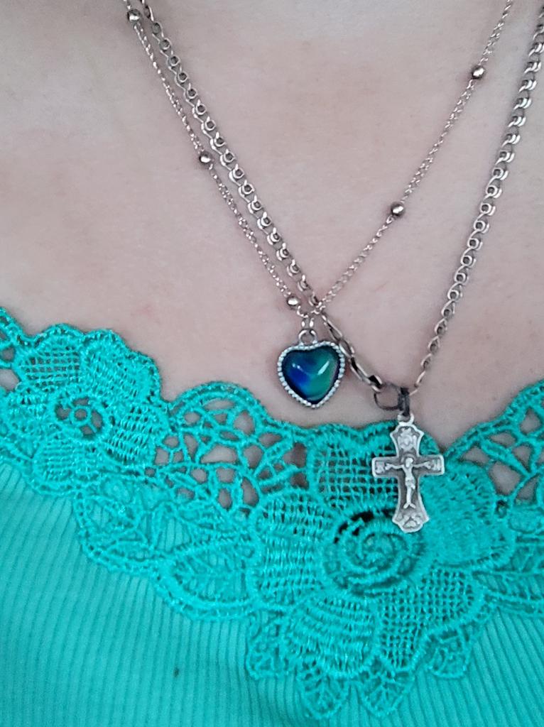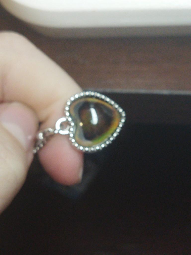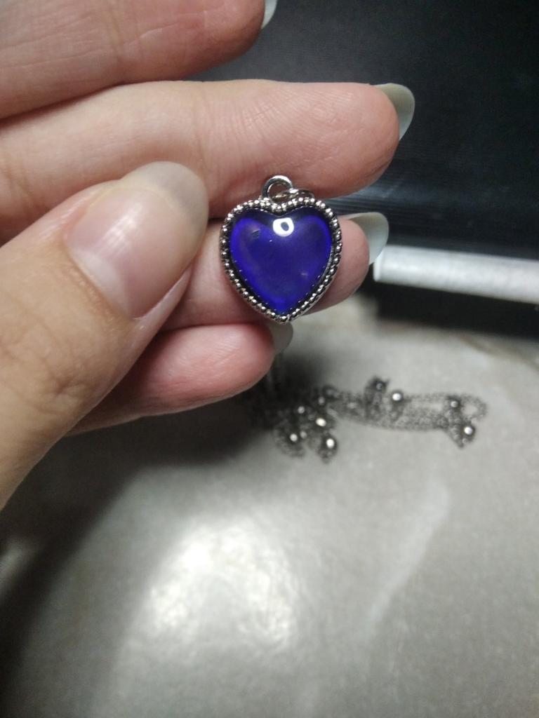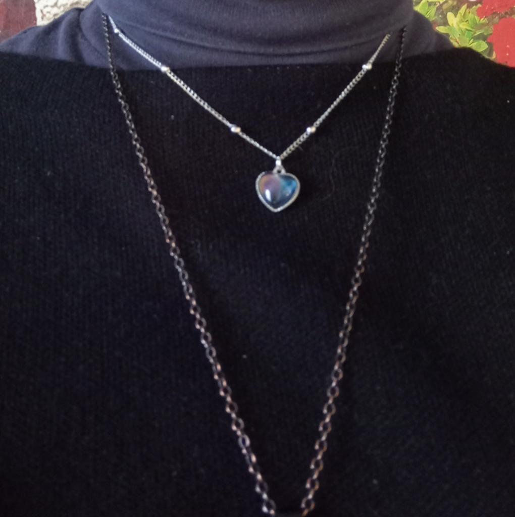 Pendentif avec un pendentif en forme de coeur. Le pendentif change de couleur en fonction de la température, par exemple bleu, vert, marron, violet, gris. J'ai bien aimé, les couleurs sont vives. La chaîne est courte, le pendentif ne peut être porté qu'avec cette chaîne, car le pendentif ne peut pas être retiré à cause des boules décoratives. Je le porte pendant plusieurs semaines jusqu'à ce qu'il fasse nuit.