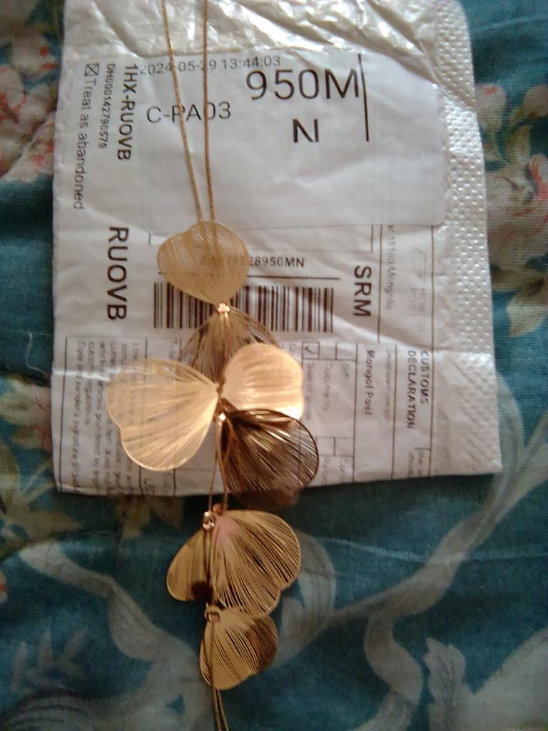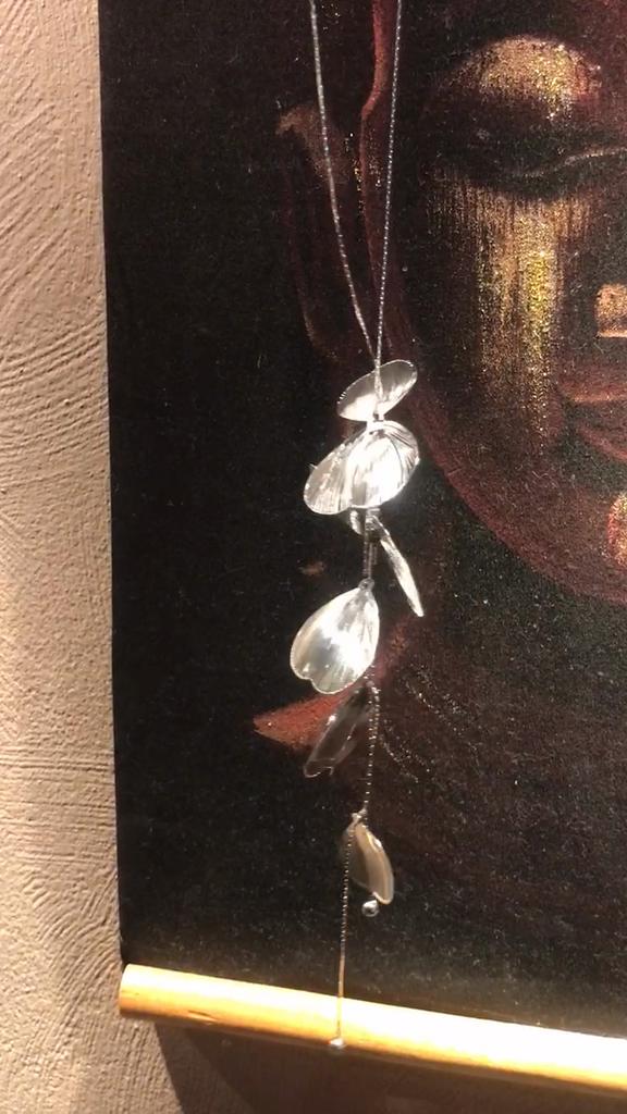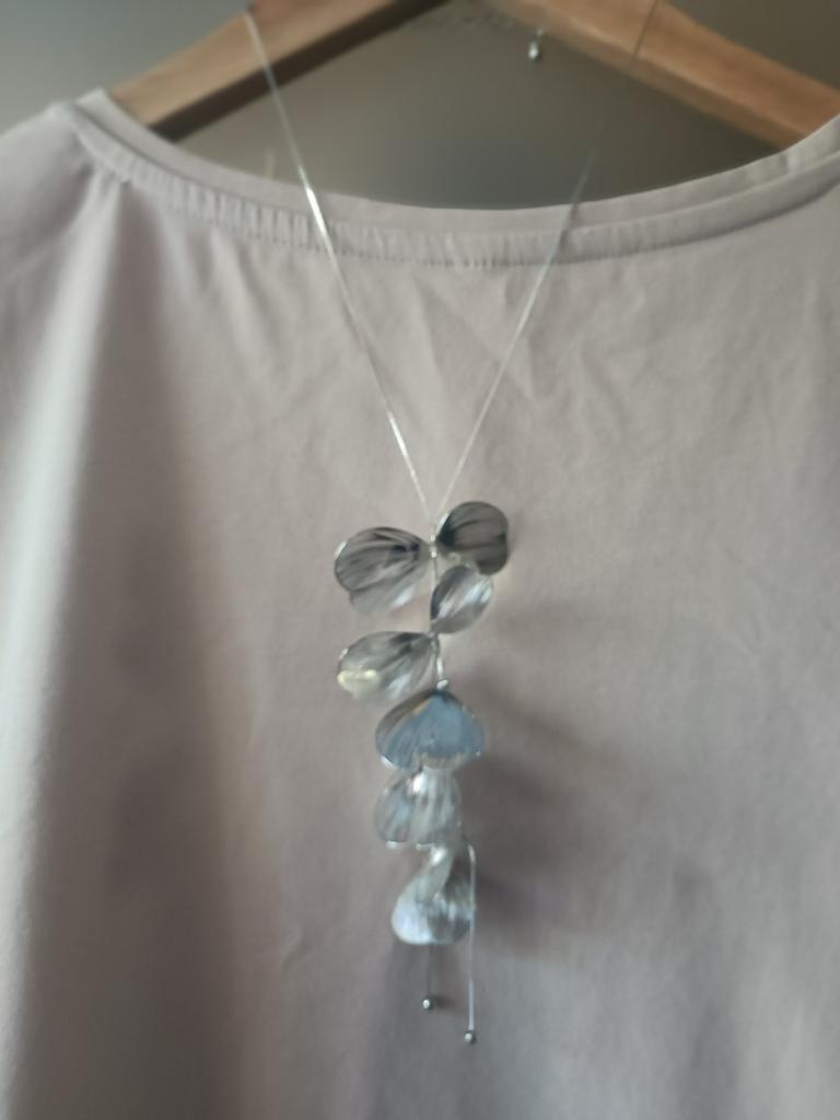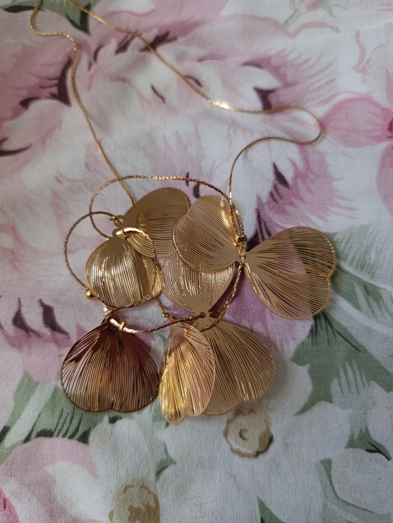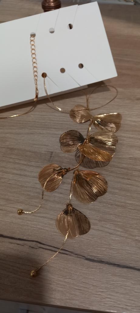 Une fragilité fascinante. Collier en forme de pétales reliés. Les pétales sont très fins, fragiles et légers. Ils sont fixés du double au simple. Le collier a l'air élégant. Le collier a une chaîne d'extension.. L'achat est charmant. Soyez heureux.