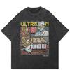 T-shirt graphique streetwear japonais en coton délavé noir, unisexe, manches courtes, été