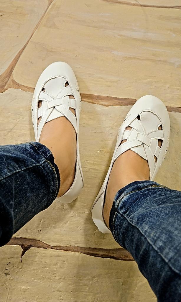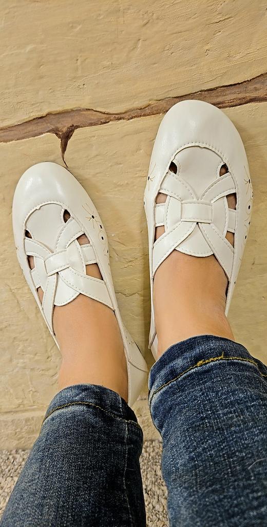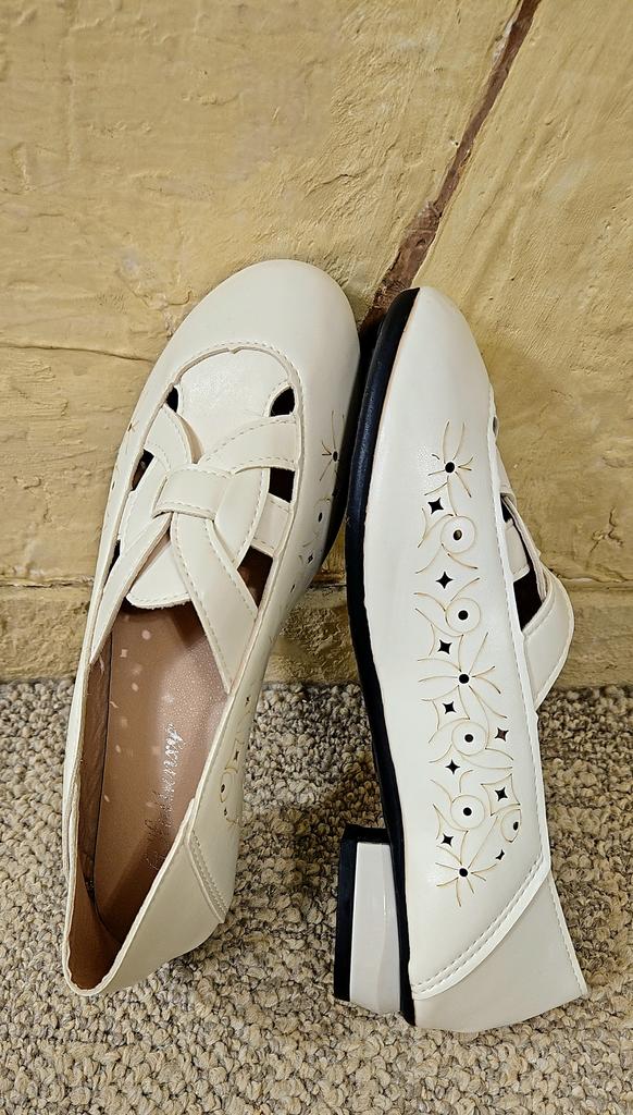 Escarpins légers et confortables🤍 Blanches, en éco-cuir souple, elles sont très confortables et élégantes au pied.. Conviennent pour le printemps chaud et même l'été. Ils sont respirants, avec des petits cercles et des losanges ajourés sur les côtés, le haut est également ajouré.. La semelle intérieure est douce, comme avec de la mousse à l'intérieur, très confortable pour le pied.. Petit talon, bonne semelle. Je porterais ça sans hésiter)) Ils sont un peu grands pour 23,5. La taille 38 est idéale pour une longueur de pied de 24 cm.. Il ne faut pas prendre plus grand, ils taillent juste.. J'ai montré les détails dans la vidéo. Fabriqués soigneusement, en usine. Prix agréable. Pas grossiers, l'éco-cuir est doux. Je recommande de tout cœur 🧡