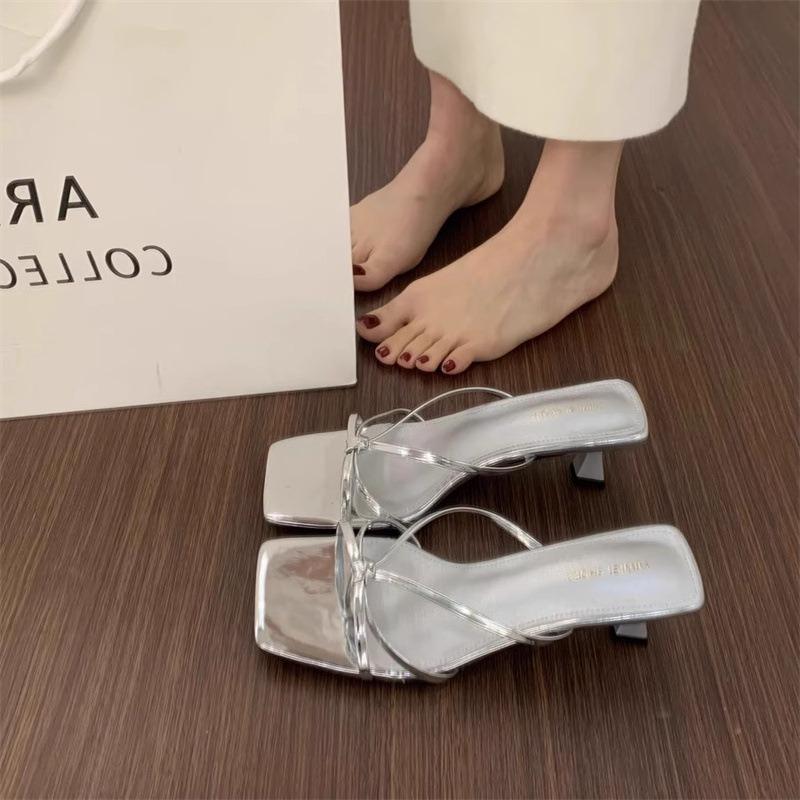 Tempérament haut de gamme pantoufles à bout ouvert vêtements d'été pour femmes talon chat avec jupe sandales argentées femmes
