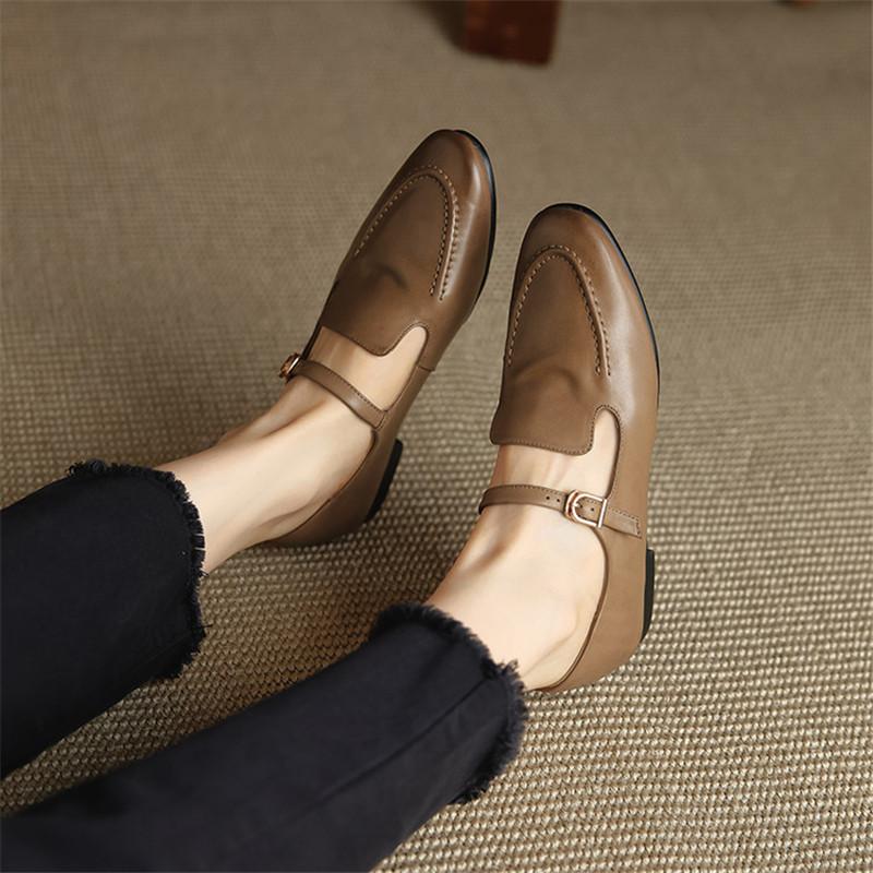 Mode Nouvelles Chaussures Femme en Cuir Véritable Printemps/Automne Bout Rond Chaussures Mary Jane pour Femmes Mode Rétro Boucle Talon Bas Plat Escarpins Femme