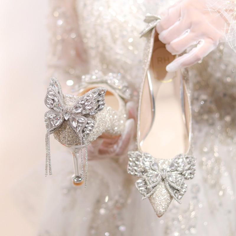 Autumn new pointed single shoes thin heel shallow mouth pearl bow high heels glossy bridesmaid wedding shoes