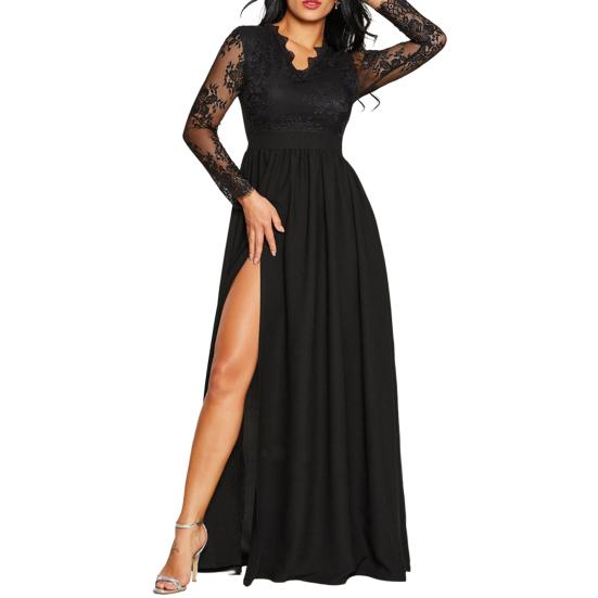 Women Evening Dress Solid Color Elegant Sweet Pleated Temperament See-through Lace Sexy High