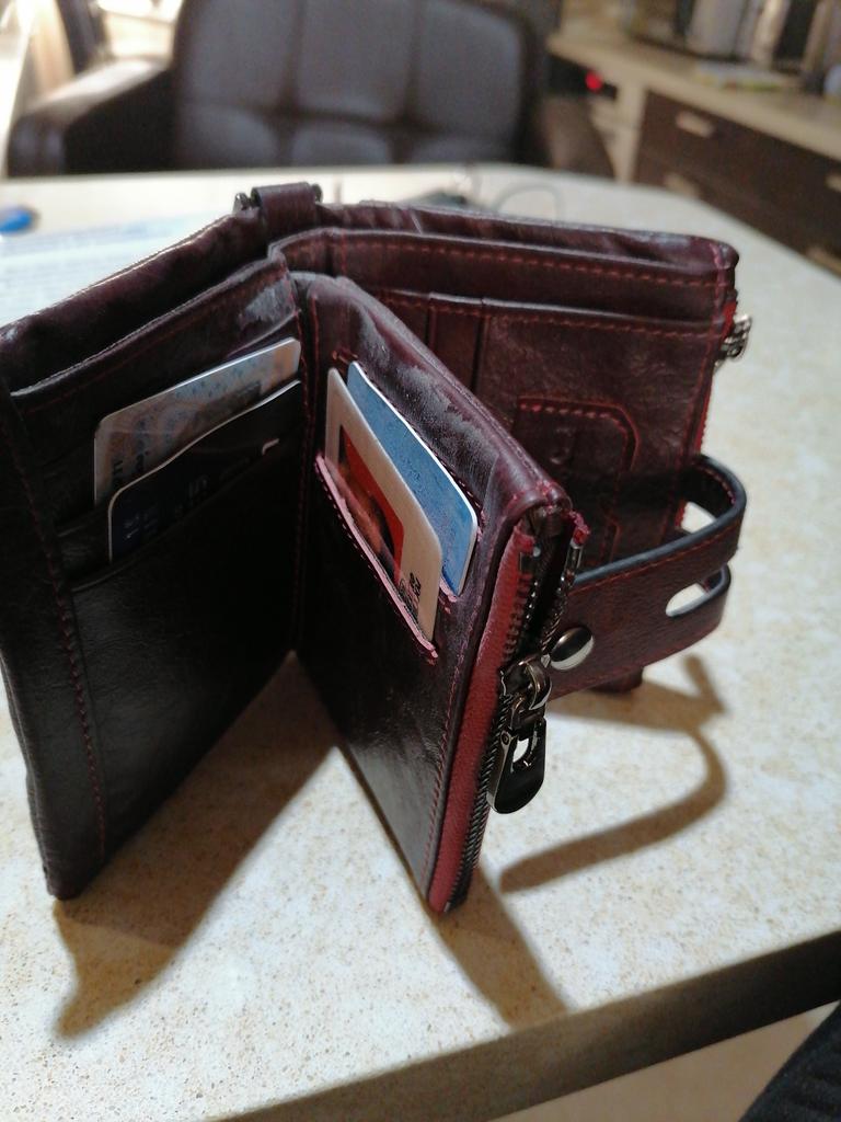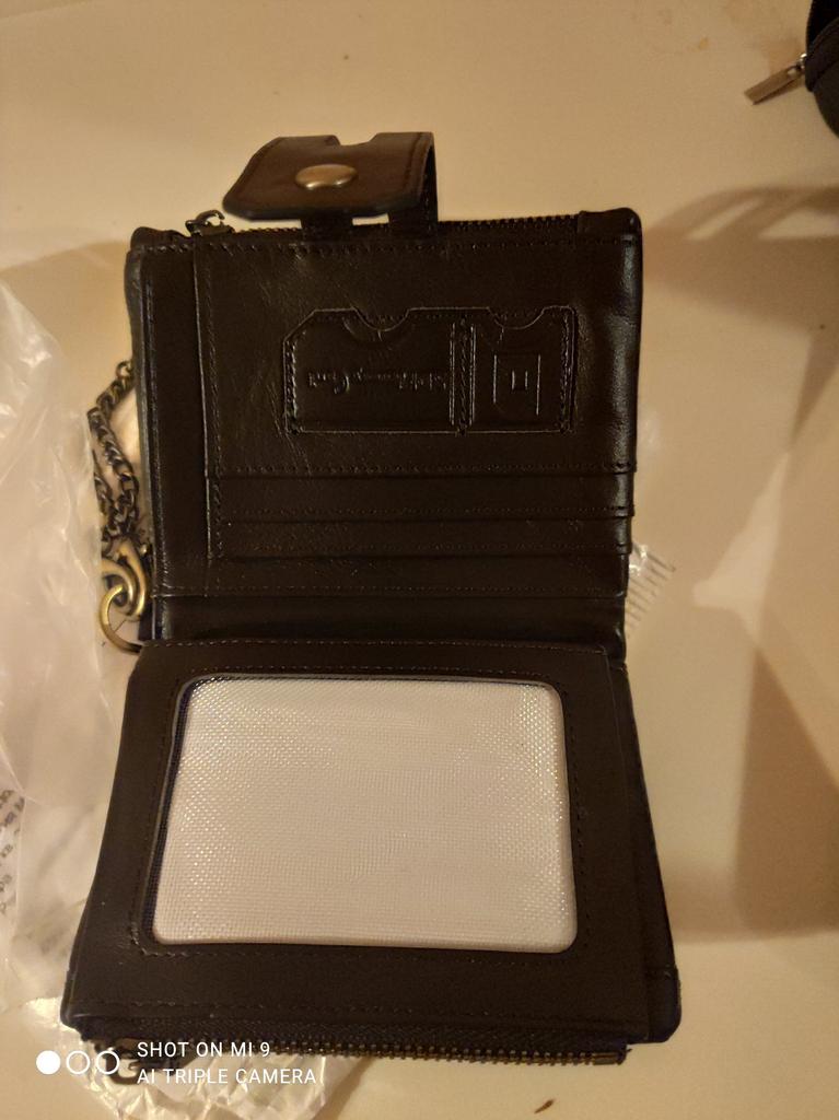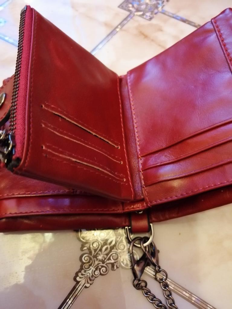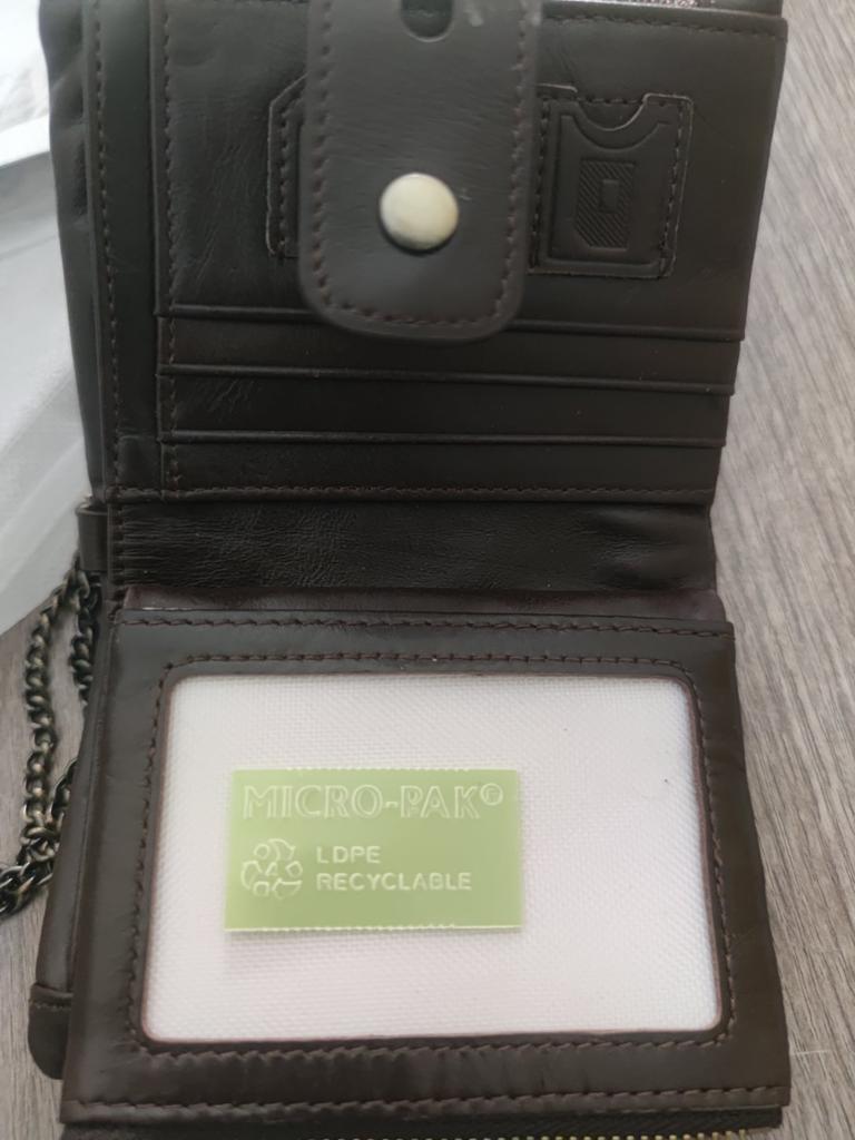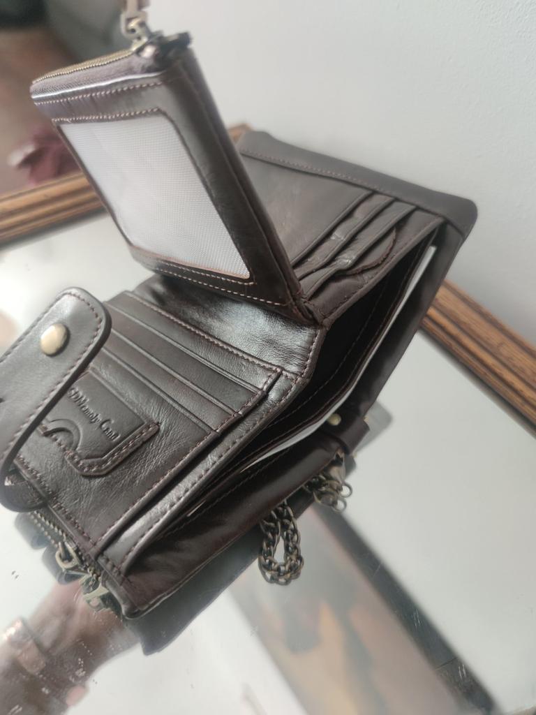 Pilna angų kreditinėms kortelėms, graži oda, grandinėlė, apsauganti nuo vagystės, daug vietos.