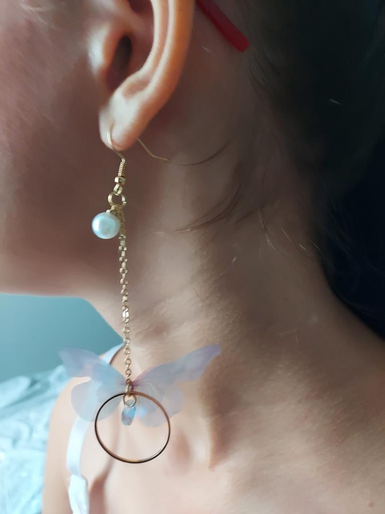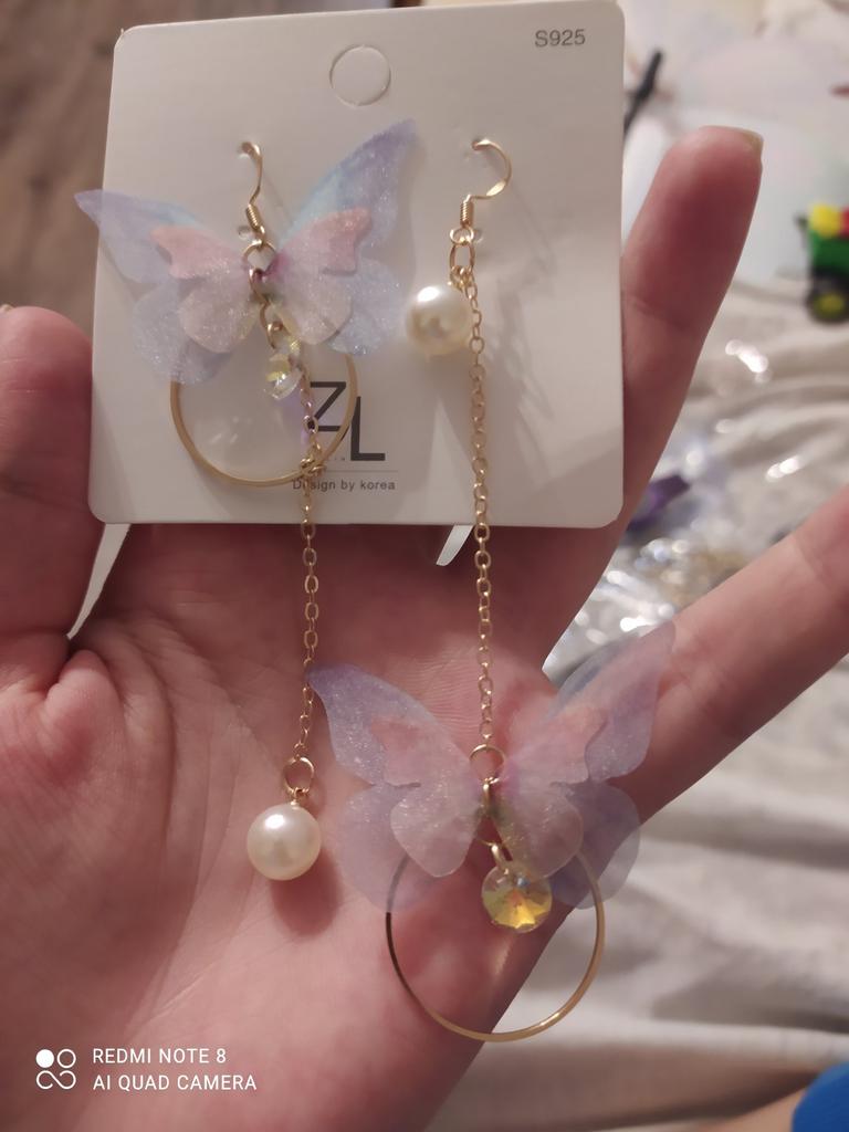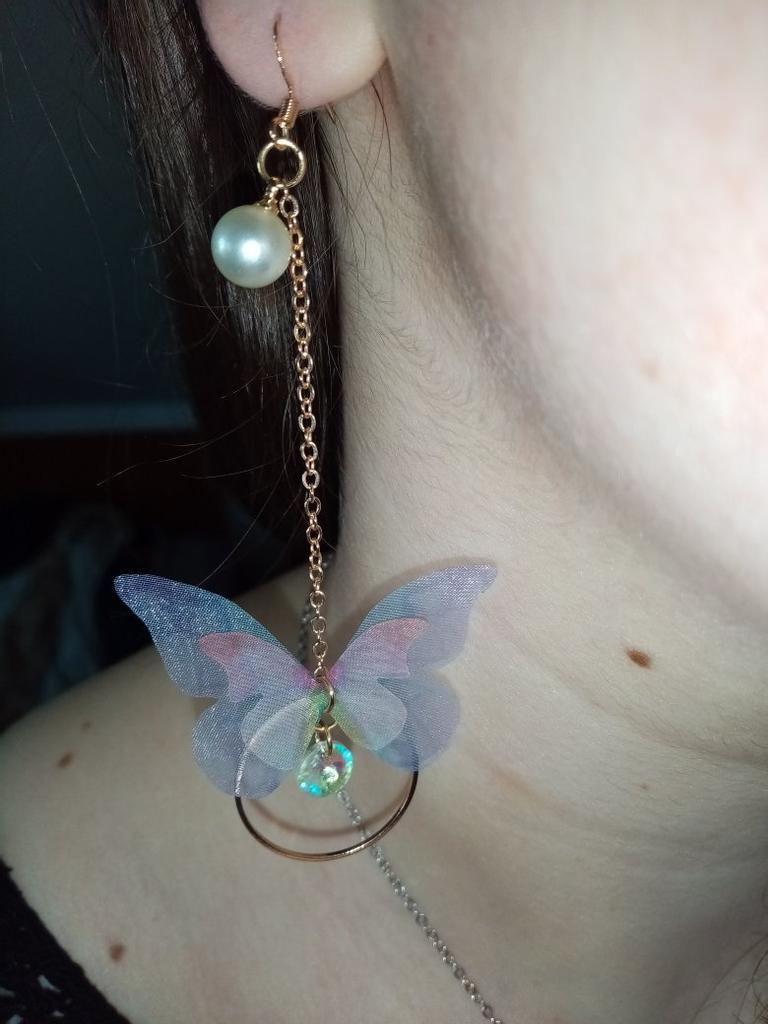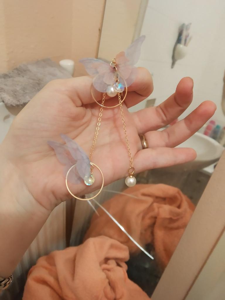 Puikūs auskarai! Jie gražūs, erdvūs ir lengvi kaip... drugeliai! 🥰🦋🦋 Grandinė paauksuota ir gležna, tačiau jos jungtys tvirtai sujungtos. Kabliukai neiškrenta iš ausų – tuo įsitikinti galite juos užsegti pakuotėje esančiais tvirtinimo įtaisais. Drugeliai iškirpti iš plono, blizgančio audinio – neapsunkina, bet linksmai šoka vėjyje.. Tikrai rekomenduoju šią prekę iš šio pardavėjo!