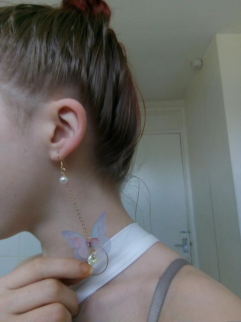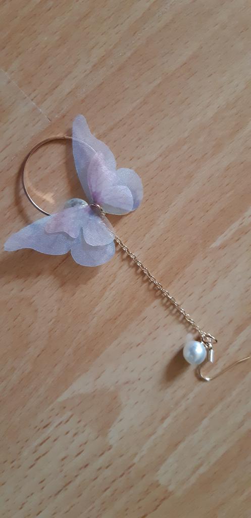 Tai specialūs auskarai. Drugelis pagamintas iš audinio.