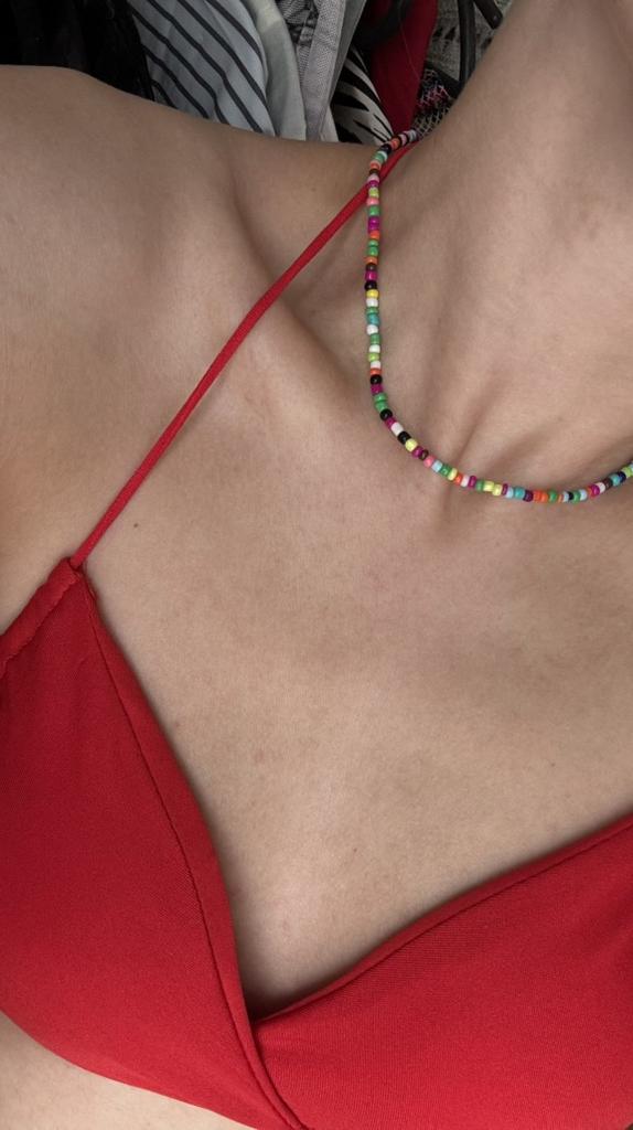 Gavau, uždėjau ir nenuėmiau. Lengvas karoliai. Nuotraukoje tarsi karoliukai didesni ir ryškesni. Bet apskritai esu patenkinta.