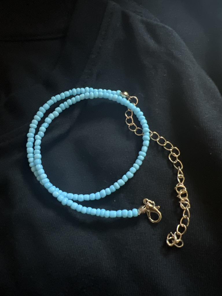 Karoliukai iš karoliukų, pasirinkta mėlynos spalvos. Ilgis reguliuojamas, patys karoliukai įvairių dydžių.