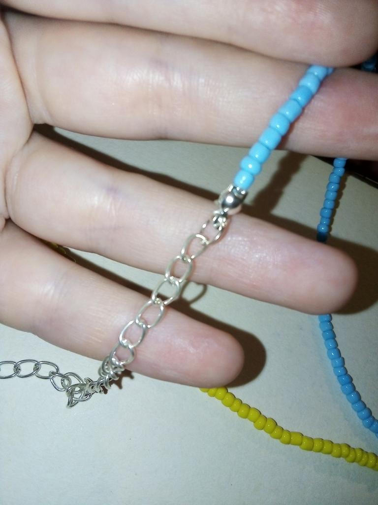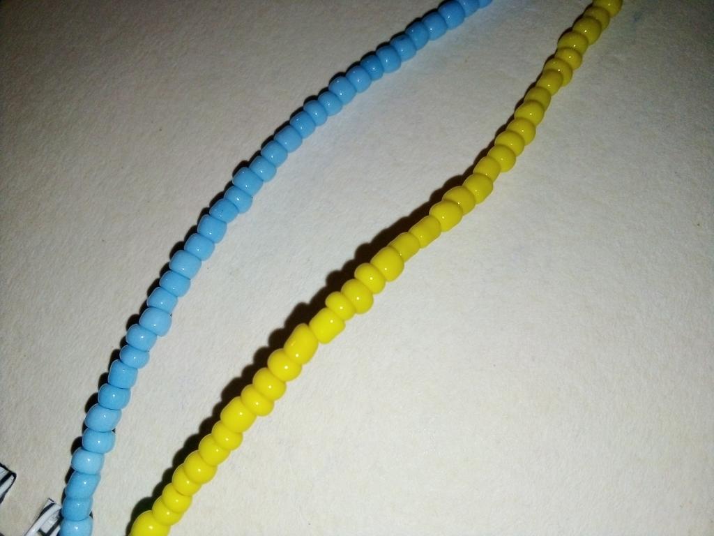 Geltona kaklelis iš karoliukų, pasirinko du, kad padarytumėte vėliavėlę iš karolių. Karoliukai be įtrūkimų ir matomų defektų, bet skirtingo dydžio. Užsegimas taisyklingas, reguliuojamas.