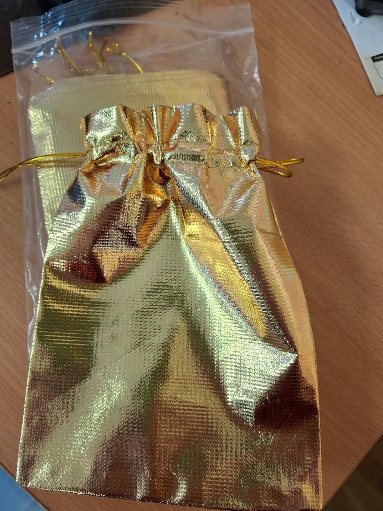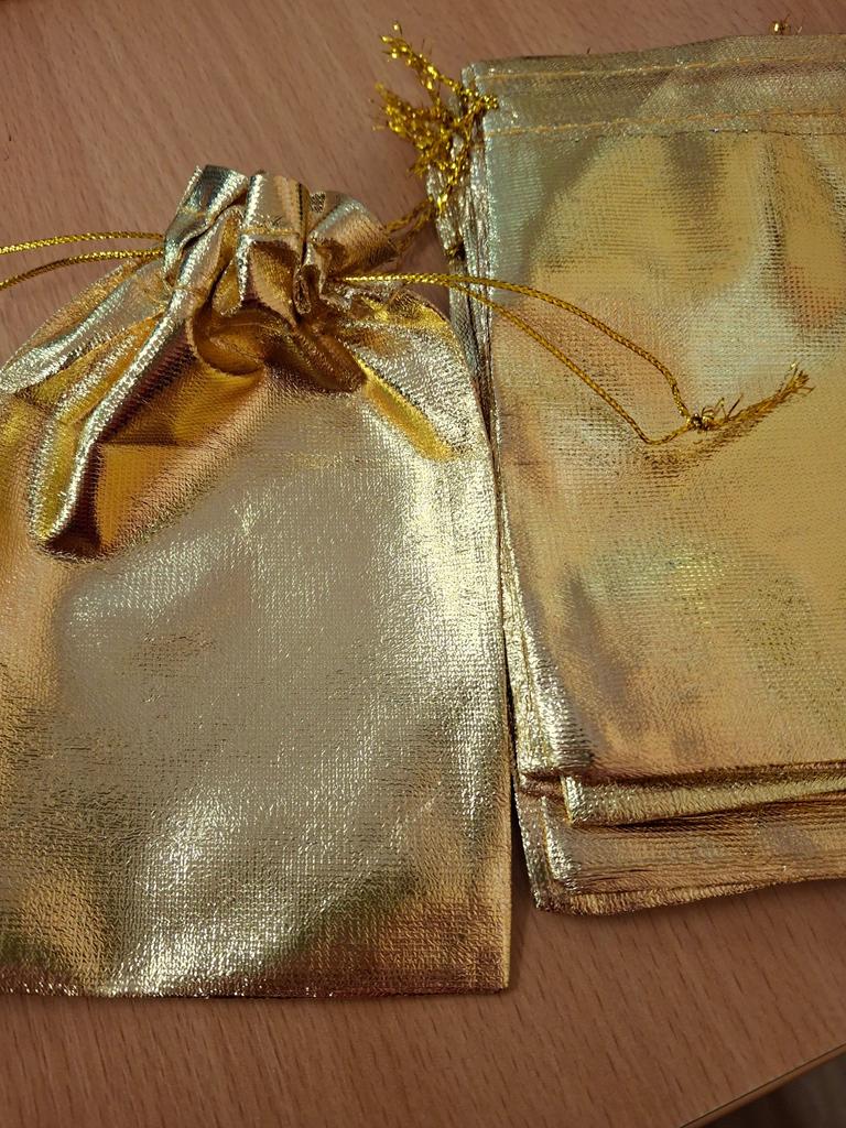 Auksinės spalvos maišeliai iš brokato tipo audinio. Maišelis susitraukia raišteliu. Atrodo puošniai, šventiškai. Galima pakuoti dovanėles.