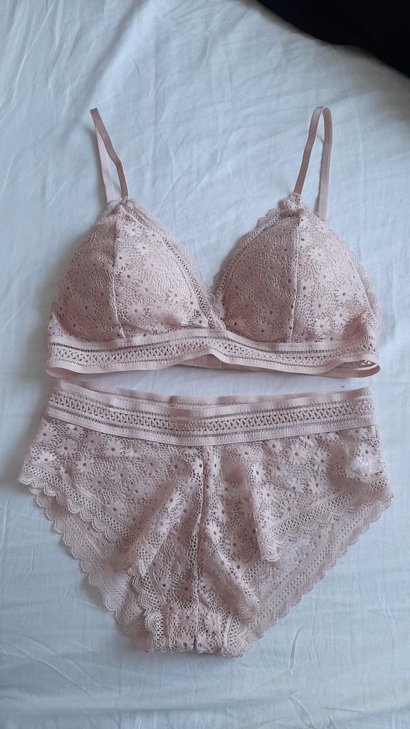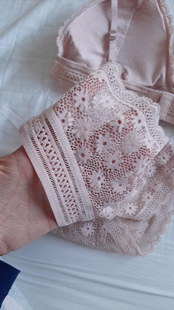 Privalumai: Labai grazus komplektukas. Persikų smėlio spalvos. Nėriniai turi gerą elastingumą, rinkčiausi dydį M/L, liemenėlė maža, turbūt B kaušelis, galima įdėti push up įdėklą.. apskritai rekomenduoju