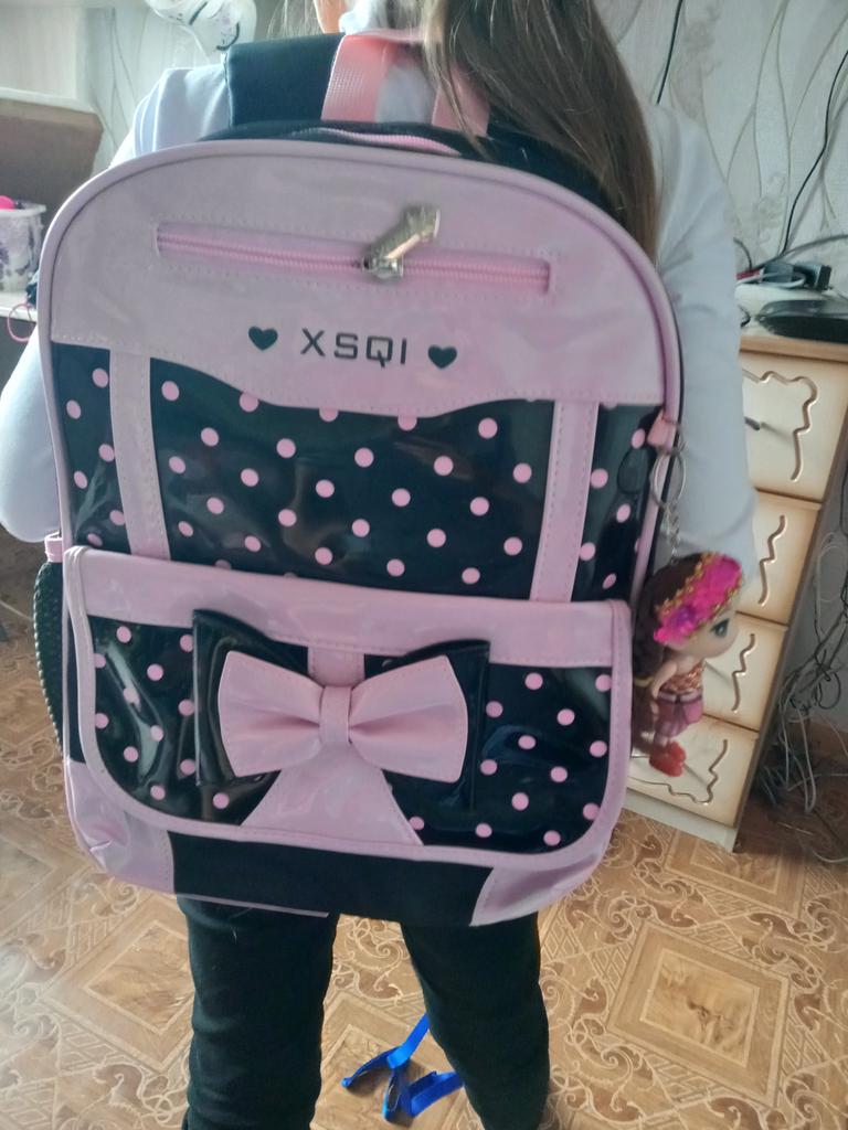Super rinkinys Kuprinės ryškiai lakuota priekinė dalis nebijo lietaus Laiminga dukra laukia kartu su juo į mokyklą Niekuo svetimu nekvepia Naujos kuprinės kvapas Rankinė taip pat gera ir talpi Jos apačioje yra lankelis ir rausvai lakuoti kampai