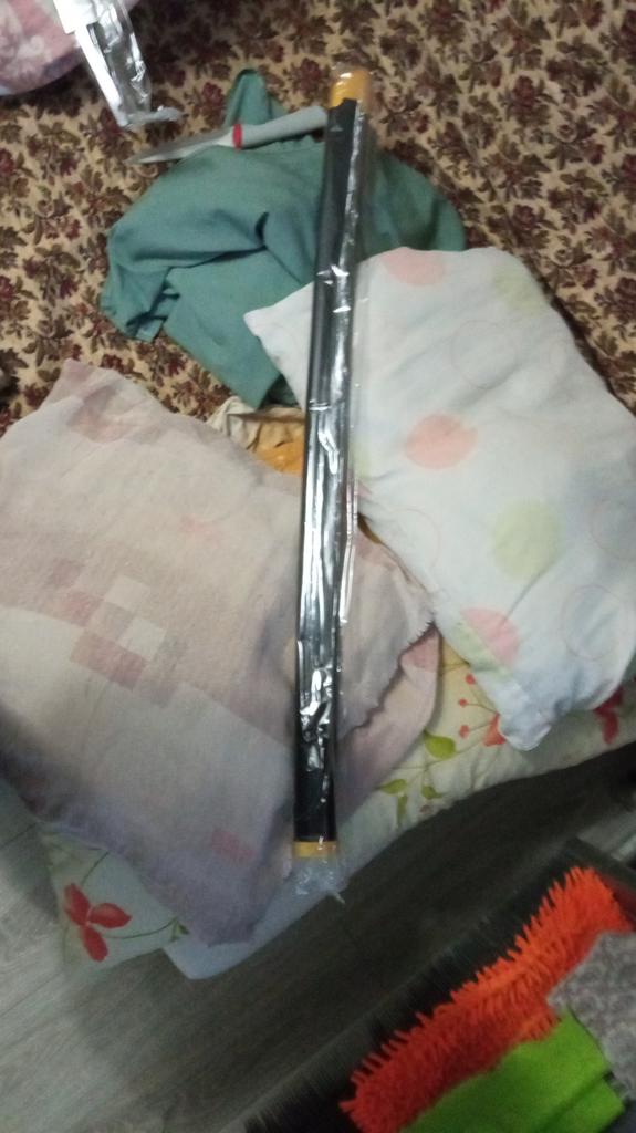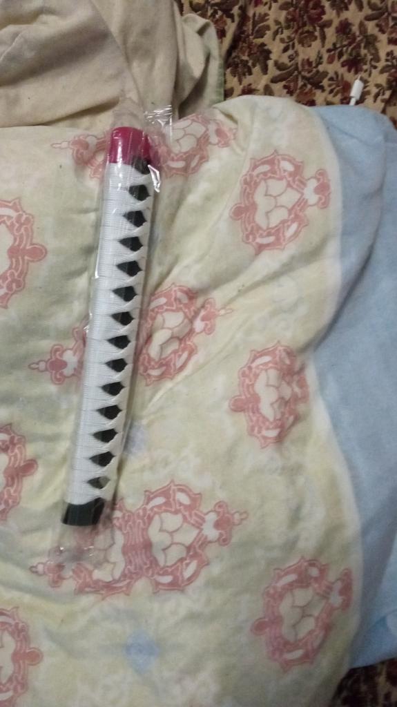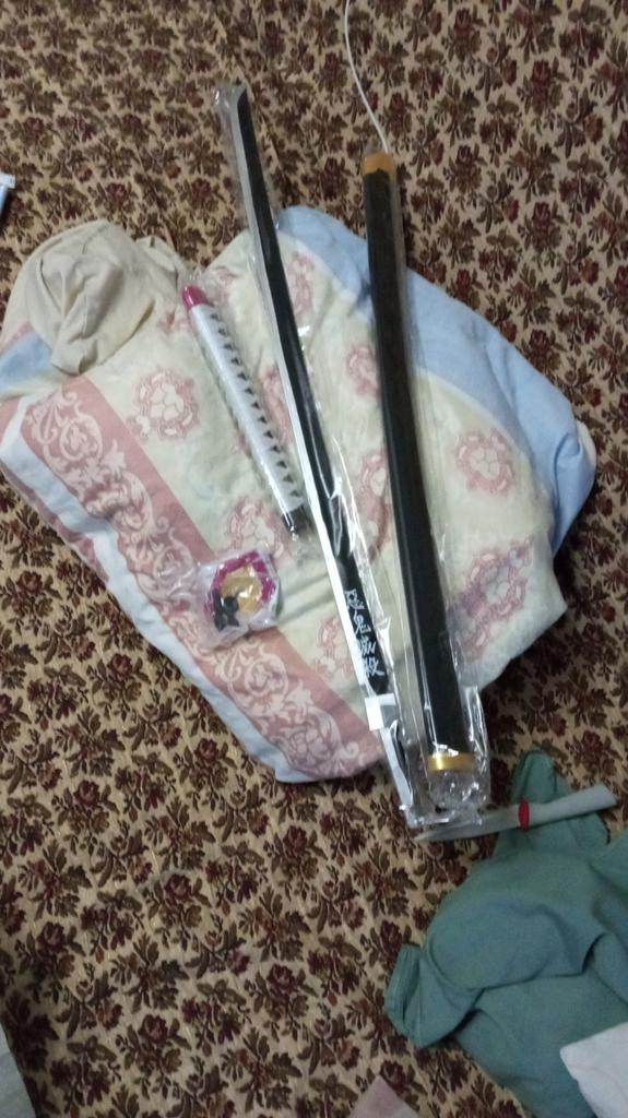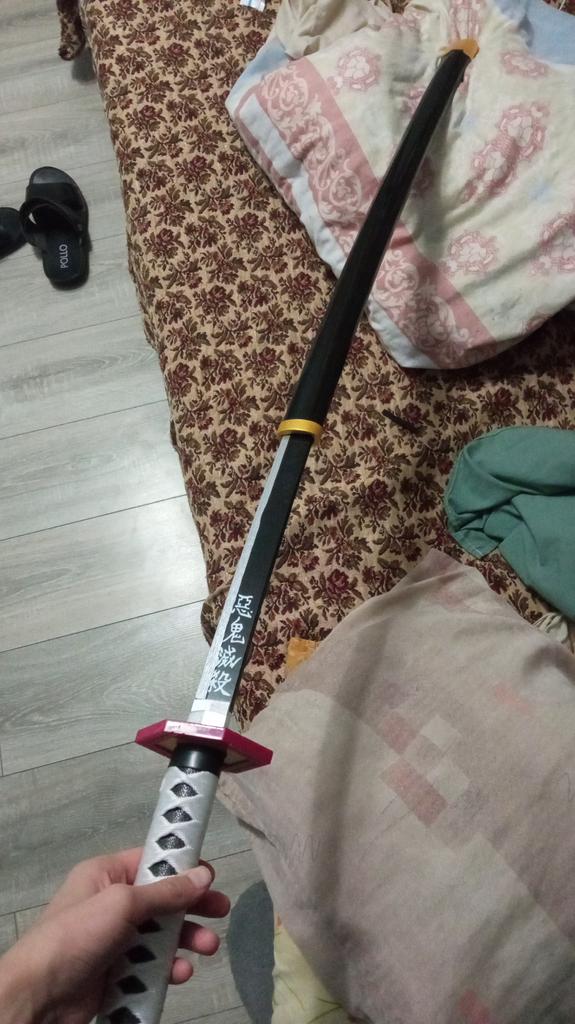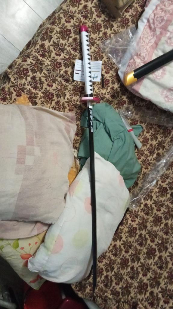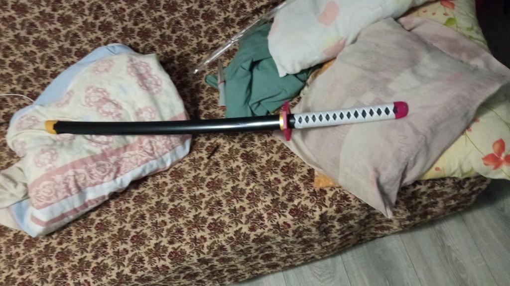 Medžiagos: -rankena: virvė ir plastikas. - Ašmenys: medis. - Korpusas: geras plastikas. -kitos „metalinės“ dalys: plastikas. Taip pat yra silikoninis ovalas rankenos tvirtinimui. Katana ateina nesurinkta: -ranka. - ašmenys. -katana rankenos kamštis (atsiprašau, aš nežinau, kaip tai padaryti teisingai). - raudonas plastiko gabalas rankenai ir ašmenims sujungti. - sidabras po plastiko. - silikoninis ovalus. - surinkimo instrukcijos. Katana lengva, maloni liesti, o medžiagos geros.