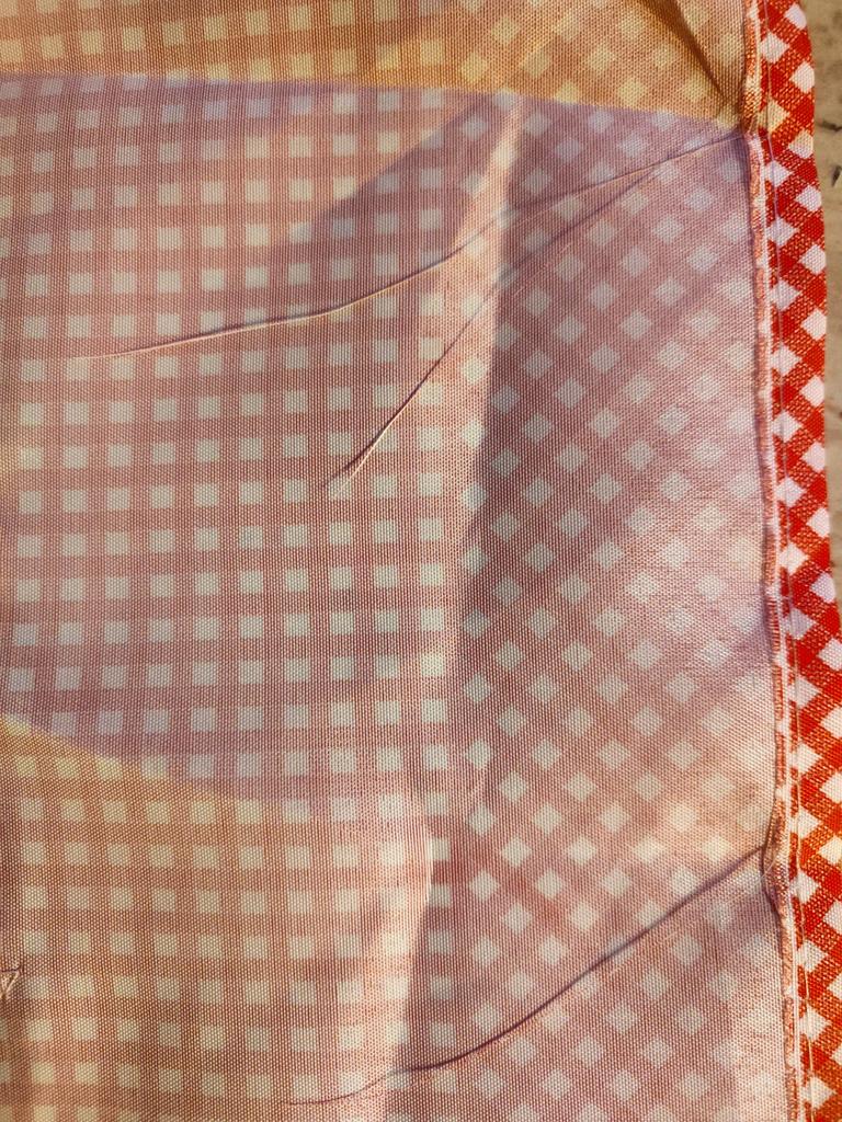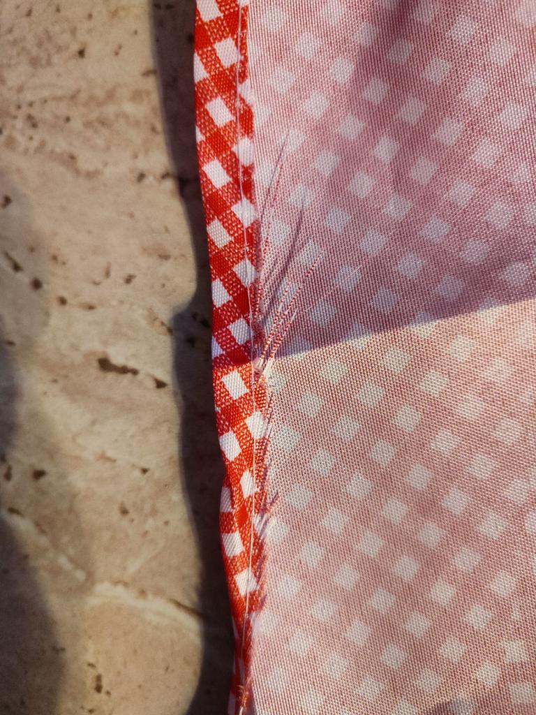 Prijuostė pasiūta netaisyklingai, keliose vietose laisva, nes prie siūlės nesusiūta dvigubai. Vienkartinės siūlės ant arkų susiraukšlėja ir byra. Nežinau kaip bus po plovimo.